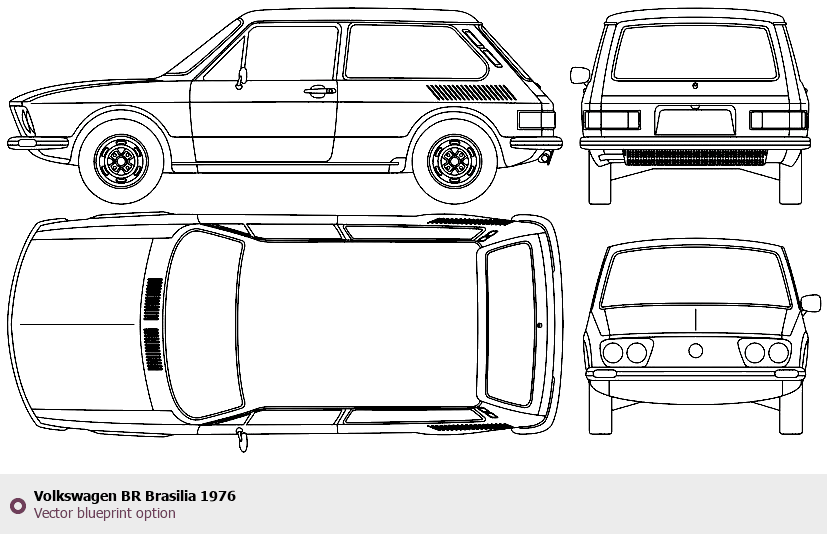 Raster blueprint of the 1976 Volkswagen BR Brasilia Tag. This free downloadable image can be used for graphic projects, digital design, and 3D modeling. The file provides accurate exterior proportions of the vehicle. Model year: 1976. Body type: Tag.