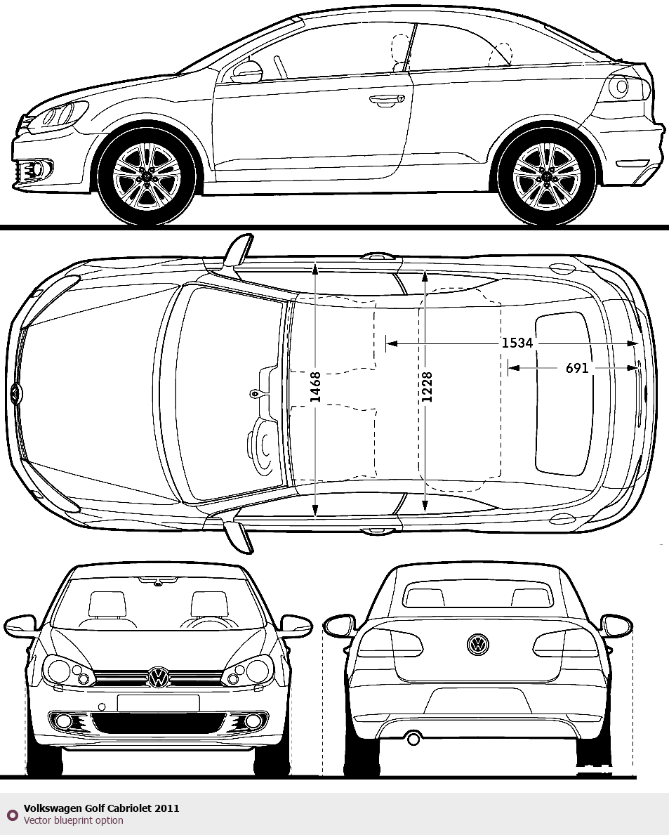 Raster blueprint of the 2011 Volkswagen Golf Cabriolet Cabriolet. This free downloadable image can be used for graphic projects, digital design, and 3D modeling. The file provides accurate exterior proportions of the vehicle. Model year: 2011. Body type: Cabriolet.