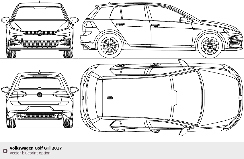 Raster blueprint of the 2017 Volkswagen Golf GTi Hatchback. This free downloadable image can be used for graphic projects, digital design, and 3D modeling. The file provides accurate exterior proportions of the vehicle. Model year: 2017. Body type: Hatchback.