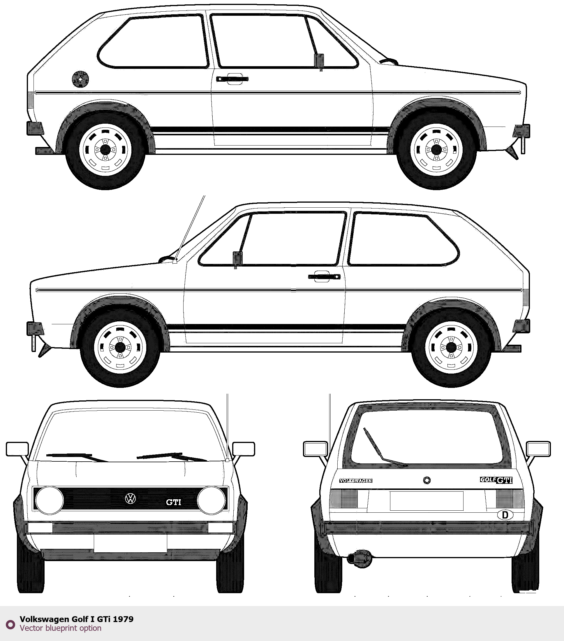 Raster blueprint of the 1979 Volkswagen Golf I GTi Tag. This free downloadable image can be used for graphic projects, digital design, and 3D modeling. The file provides accurate exterior proportions of the vehicle. Model year: 1979. Body type: Tag.
