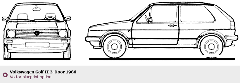 Raster blueprint of the 1986 Volkswagen Golf II 3-Door Tag. This free downloadable image can be used for graphic projects, digital design, and 3D modeling. The file provides accurate exterior proportions of the vehicle. Model year: 1986. Body type: Tag.