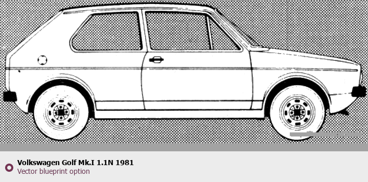 Raster blueprint of the 1981 Volkswagen Golf Mk.I 1.1N Tag. This free downloadable image can be used for graphic projects, digital design, and 3D modeling. The file provides accurate exterior proportions of the vehicle. Model year: 1981. Body type: Tag.
