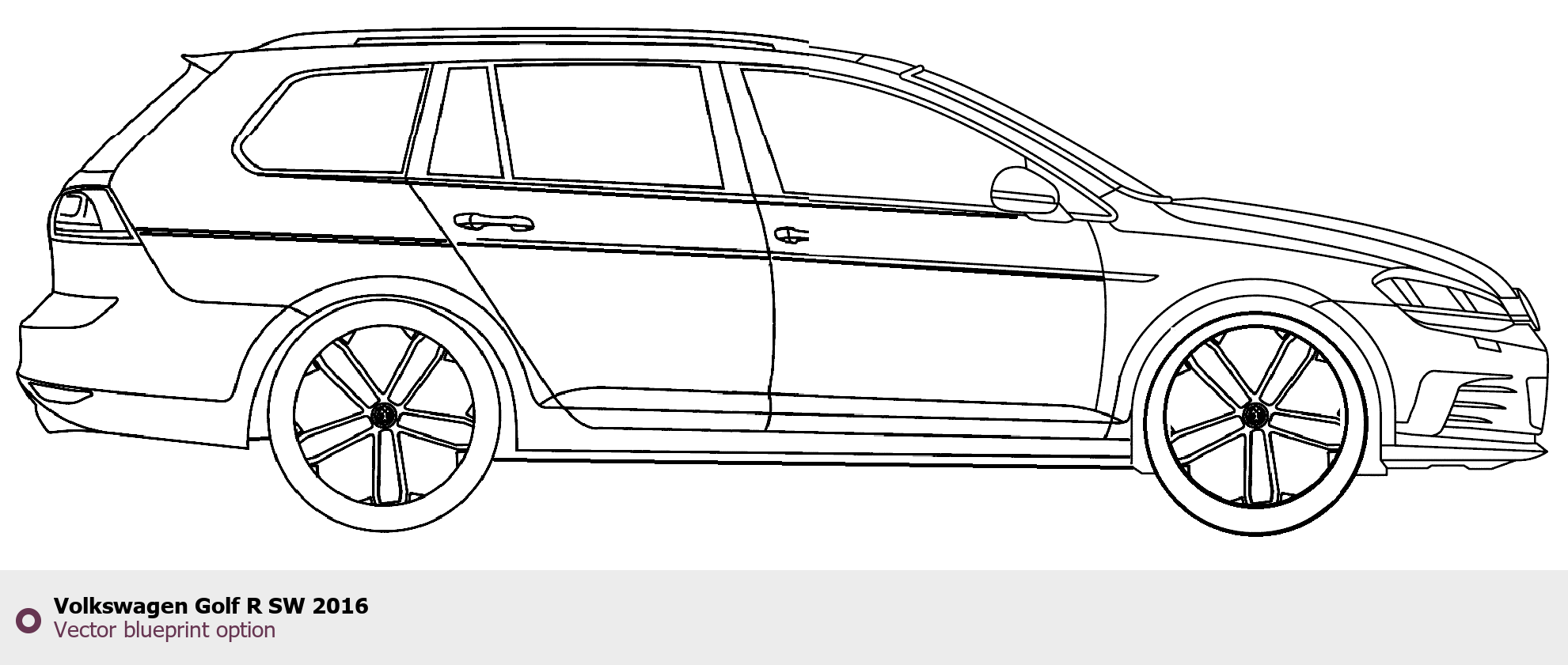 Raster blueprint of the 2016 Volkswagen Golf R SW Tag. This free downloadable image can be used for graphic projects, digital design, and 3D modeling. The file provides accurate exterior proportions of the vehicle. Model year: 2016. Body type: Tag.