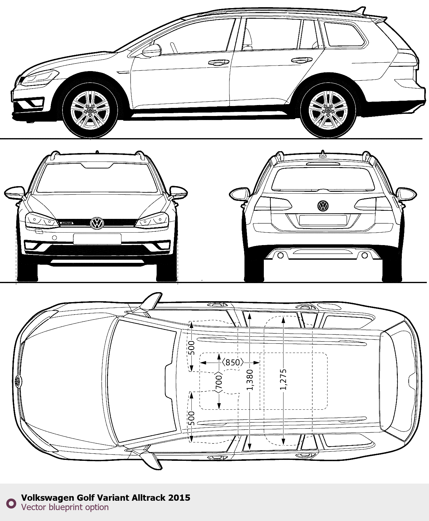 Raster blueprint of the 2015 Volkswagen Golf Variant Alltrack Wagon. This free downloadable image can be used for graphic projects, digital design, and 3D modeling. The file provides accurate exterior proportions of the vehicle. Model year: 2015. Body type: Wagon.
