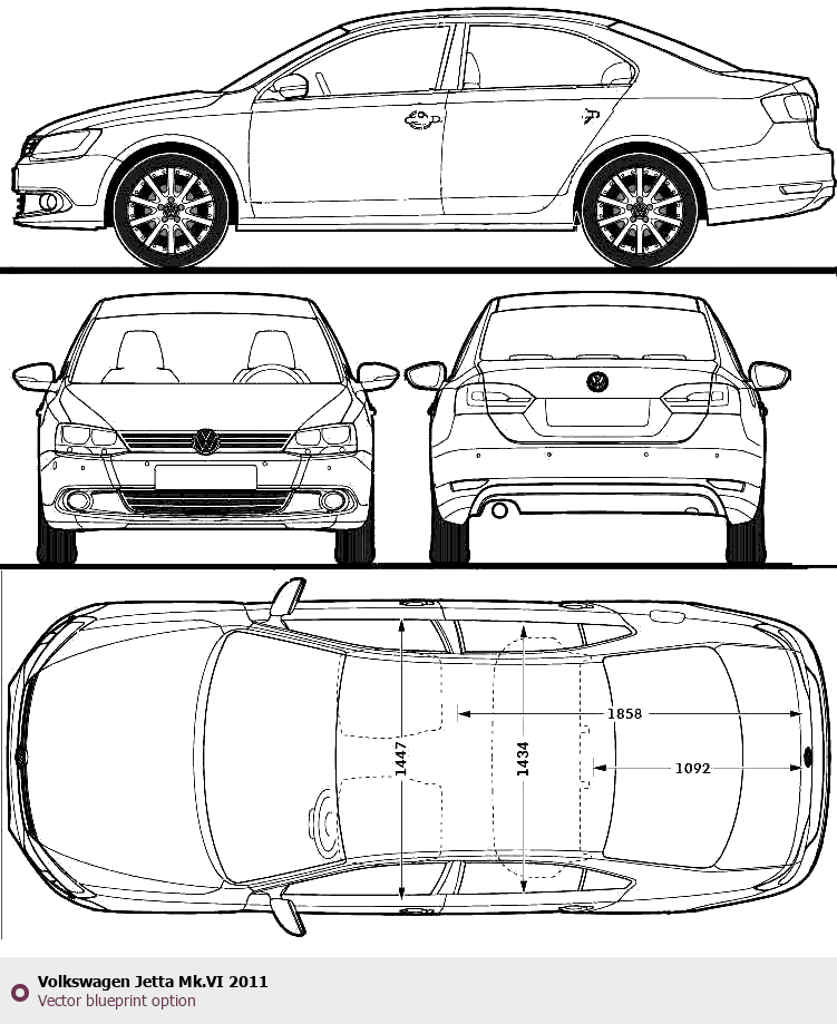 Raster blueprint of the 2011 Volkswagen Jetta Mk.VI Tag. This free downloadable image can be used for graphic projects, digital design, and 3D modeling. The file provides accurate exterior proportions of the vehicle. Model year: 2011. Body type: Tag.
