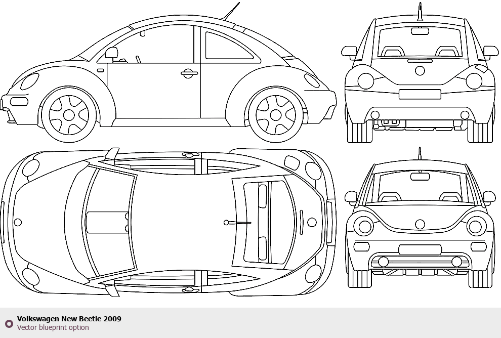 Raster blueprint of the 2009 Volkswagen New Beetle Hatchback. This free downloadable image can be used for graphic projects, digital design, and 3D modeling. The file provides accurate exterior proportions of the vehicle. Model year: 2009. Body type: Hatchback.