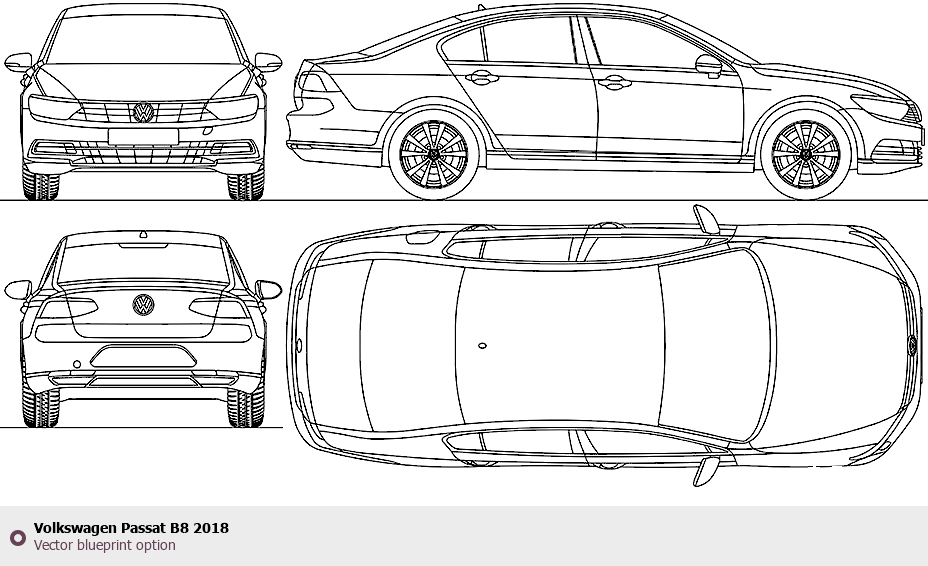 Raster blueprint of the 2018 Volkswagen Passat B8 Tag. This free downloadable image can be used for graphic projects, digital design, and 3D modeling. The file provides accurate exterior proportions of the vehicle. Model year: 2018. Body type: Tag.