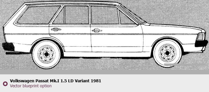 Raster blueprint of the 1981 Volkswagen Passat Mk.I 1.5 LD Variant Wagon. This free downloadable image can be used for graphic projects, digital design, and 3D modeling. The file provides accurate exterior proportions of the vehicle. Model year: 1981. Body type: Wagon.