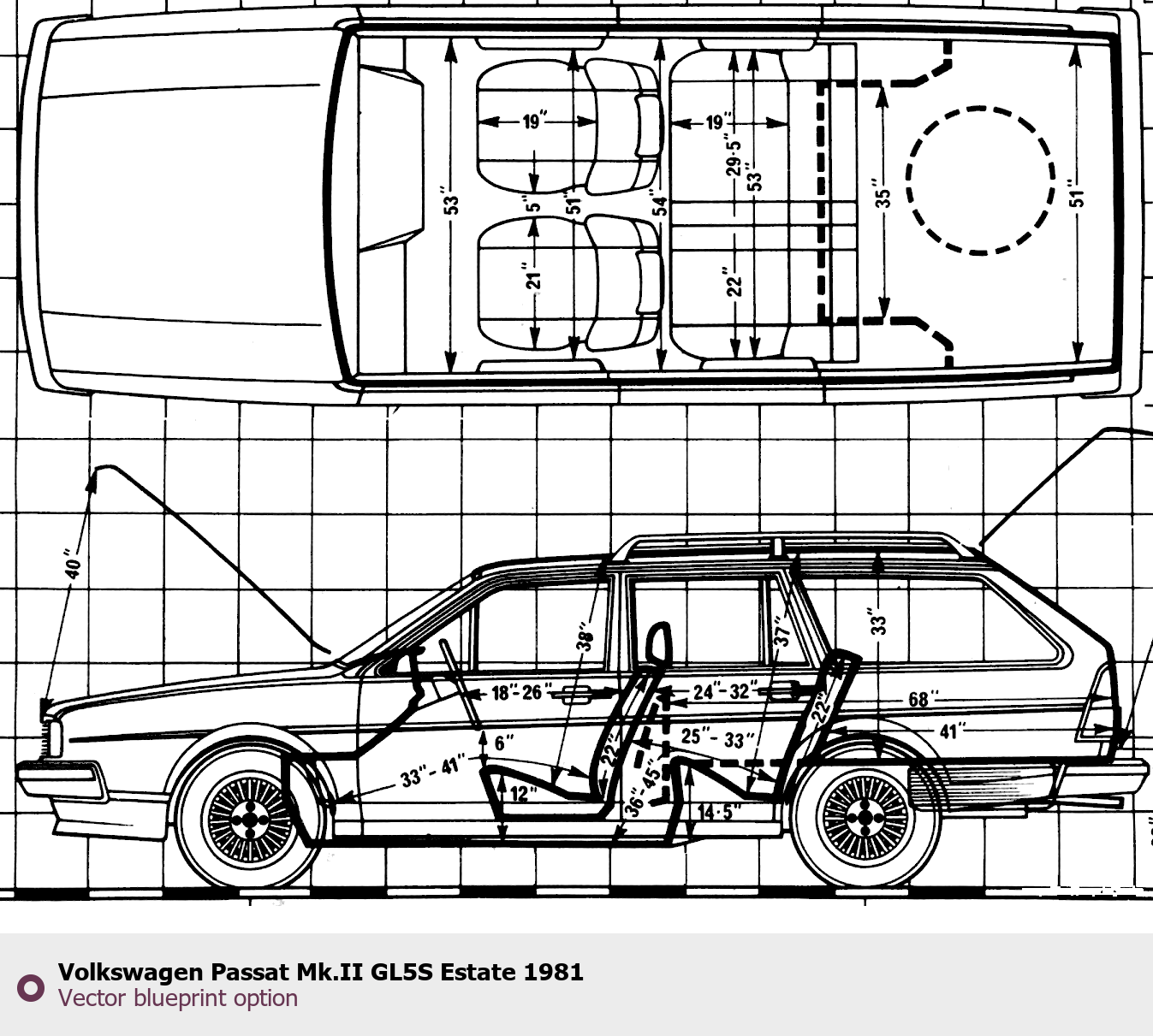 Raster blueprint of the 1981 Volkswagen Passat Mk.II GL5S Estate Wagon. This free downloadable image can be used for graphic projects, digital design, and 3D modeling. The file provides accurate exterior proportions of the vehicle. Model year: 1981. Body type: Wagon.