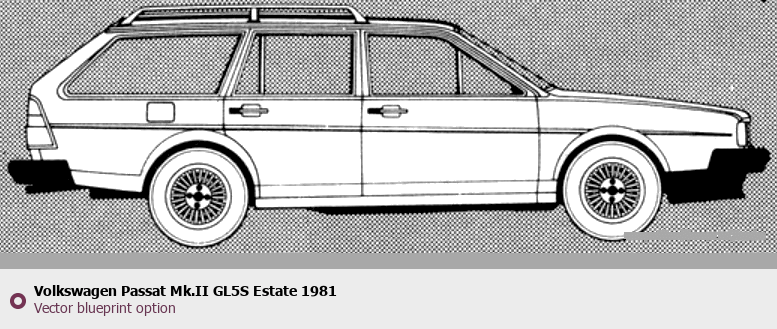 Raster blueprint of the 1981 Volkswagen Passat Mk.II GL5S Estate Wagon. This free downloadable image can be used for graphic projects, digital design, and 3D modeling. The file provides accurate exterior proportions of the vehicle. Model year: 1981. Body type: Wagon.