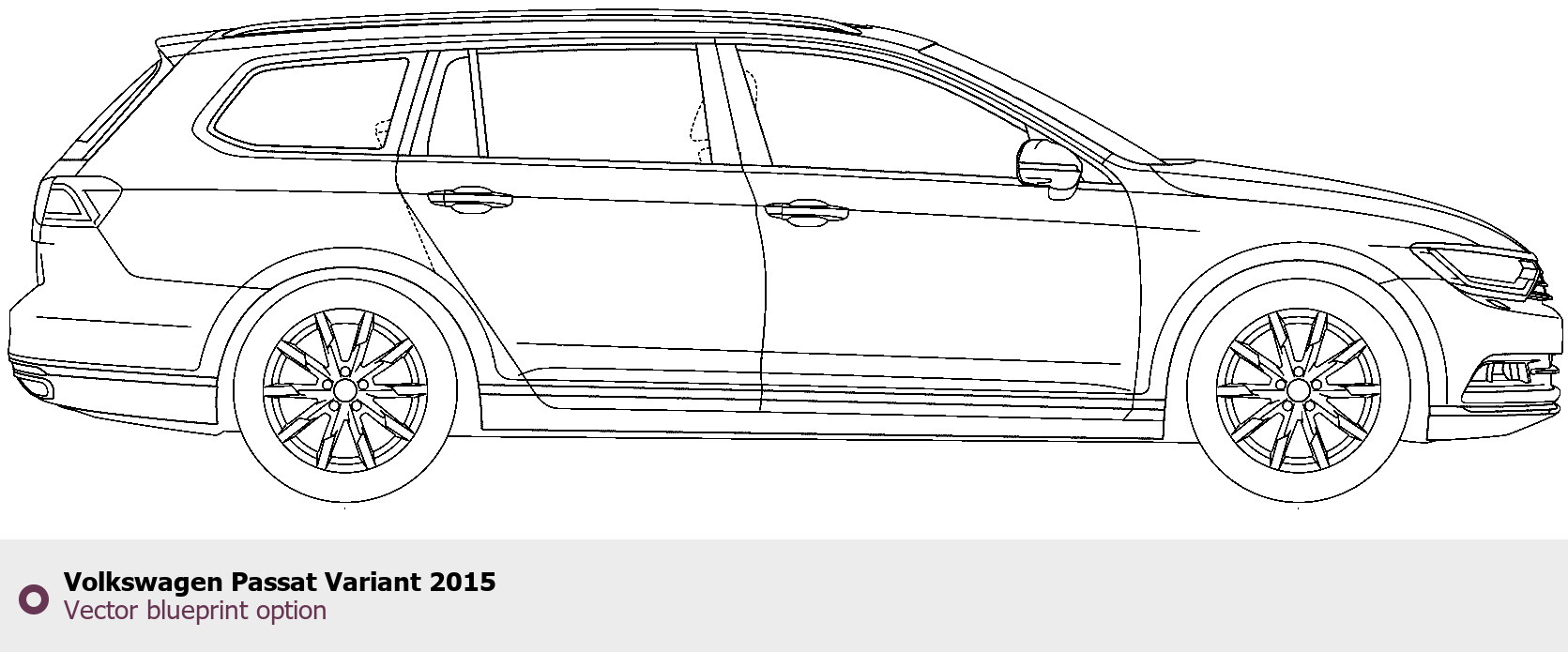 Raster blueprint of the 2015 Volkswagen Passat Variant Wagon. This free downloadable image can be used for graphic projects, digital design, and 3D modeling. The file provides accurate exterior proportions of the vehicle. Model year: 2015. Body type: Wagon.