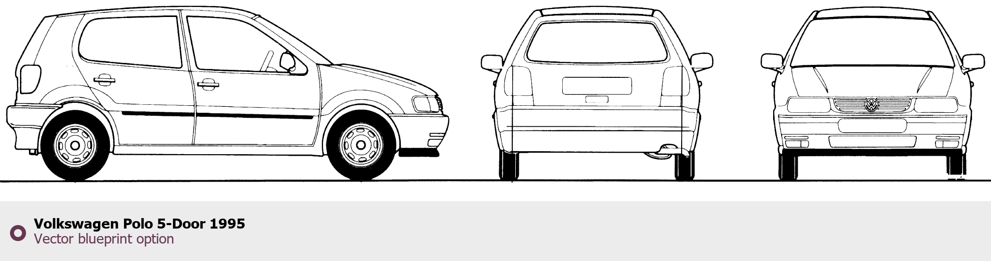 Raster blueprint of the 1995 Volkswagen Polo 5-Door Tag. This free downloadable image can be used for graphic projects, digital design, and 3D modeling. The file provides accurate exterior proportions of the vehicle. Model year: 1995. Body type: Tag.