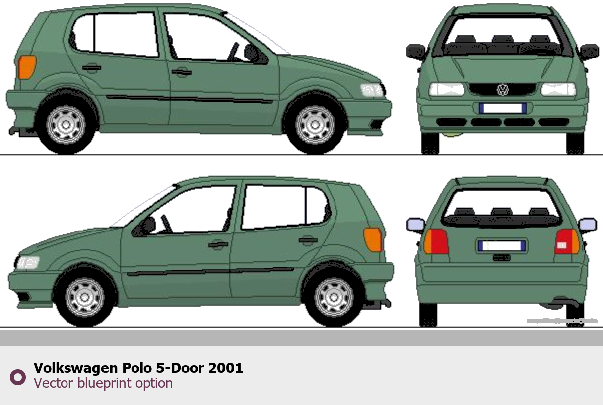 Raster blueprint of the 2001 Volkswagen Polo 5-Door Tag. This free downloadable image can be used for graphic projects, digital design, and 3D modeling. The file provides accurate exterior proportions of the vehicle. Model year: 2001. Body type: Tag.