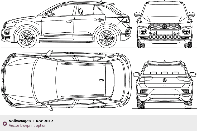Raster blueprint of the 2017 Volkswagen T-Roc SUV. This free downloadable image can be used for graphic projects, digital design, and 3D modeling. The file provides accurate exterior proportions of the vehicle. Model year: 2017. Body type: SUV.
