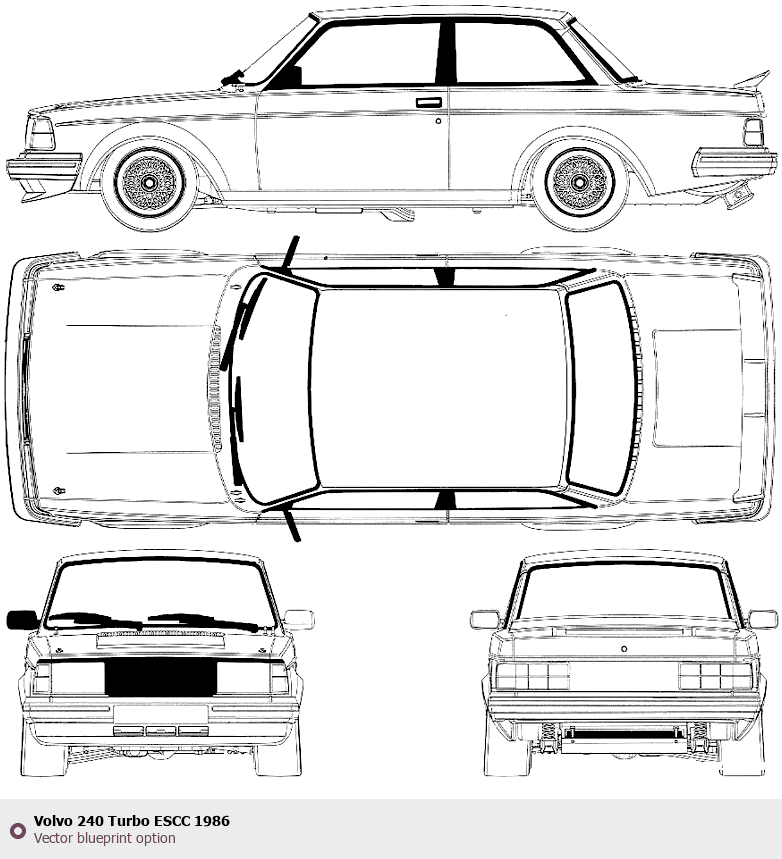 Raster blueprint of the 1986 Volvo 240 Turbo ESCC Tag. This free downloadable image can be used for graphic projects, digital design, and 3D modeling. The file provides accurate exterior proportions of the vehicle. Model year: 1986. Body type: Tag.