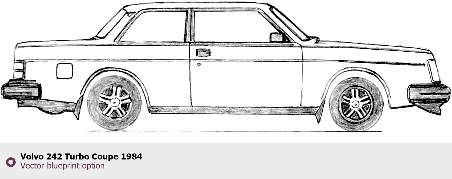 Raster blueprint of the 1984 Volvo 242 Turbo Coupe Coupe. This free downloadable image can be used for graphic projects, digital design, and 3D modeling. The file provides accurate exterior proportions of the vehicle. Model year: 1984. Body type: Coupe.