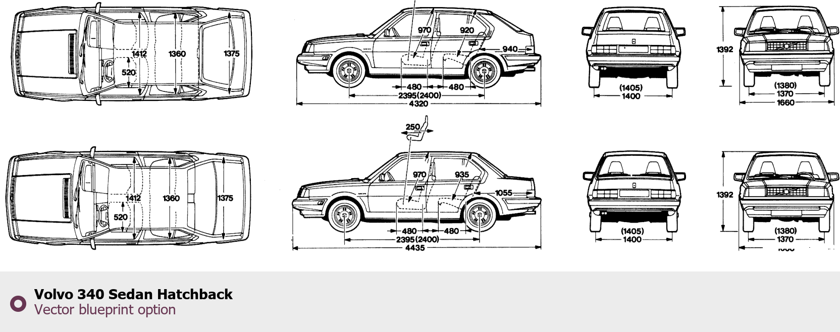 Raster blueprint of the Volvo 340 Sedan Hatchback Sedan. This free downloadable image can be used for graphic projects, digital design, and 3D modeling. The file provides accurate exterior proportions of the vehicle. Body type: Sedan.