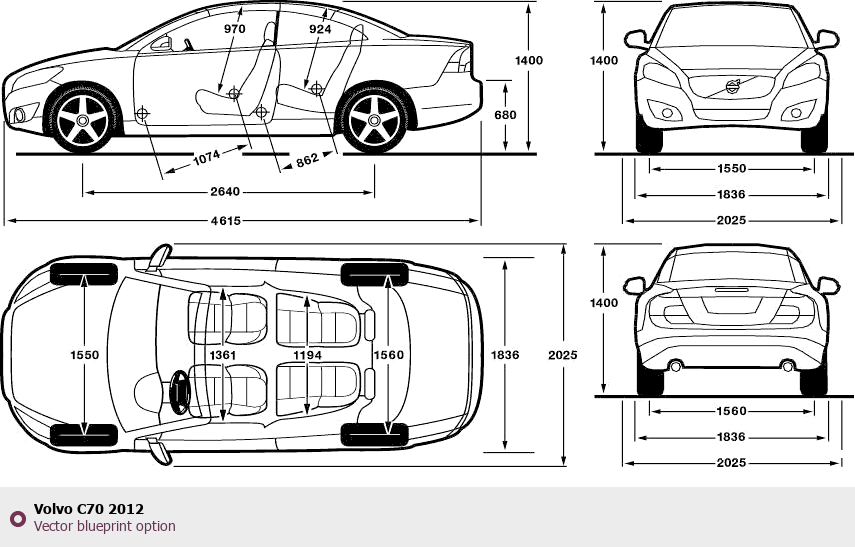 Raster blueprint of the 2012 Volvo C70 Cabriolet. This free downloadable image can be used for graphic projects, digital design, and 3D modeling. The file provides accurate exterior proportions of the vehicle. Model year: 2012. Body type: Cabriolet.