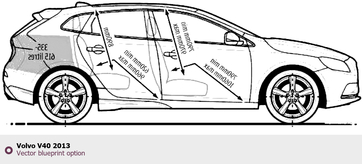 Raster blueprint of the 2013 Volvo V40 Tag. This free downloadable image can be used for graphic projects, digital design, and 3D modeling. The file provides accurate exterior proportions of the vehicle. Model year: 2013. Body type: Tag.