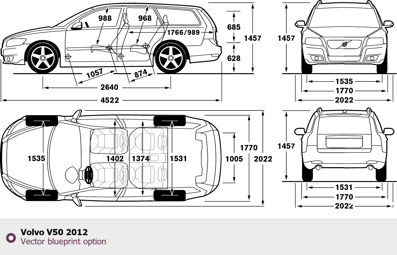 Raster blueprint of the 2012 Volvo V50 Wagon. This free downloadable image can be used for graphic projects, digital design, and 3D modeling. The file provides accurate exterior proportions of the vehicle. Model year: 2012. Body type: Wagon.