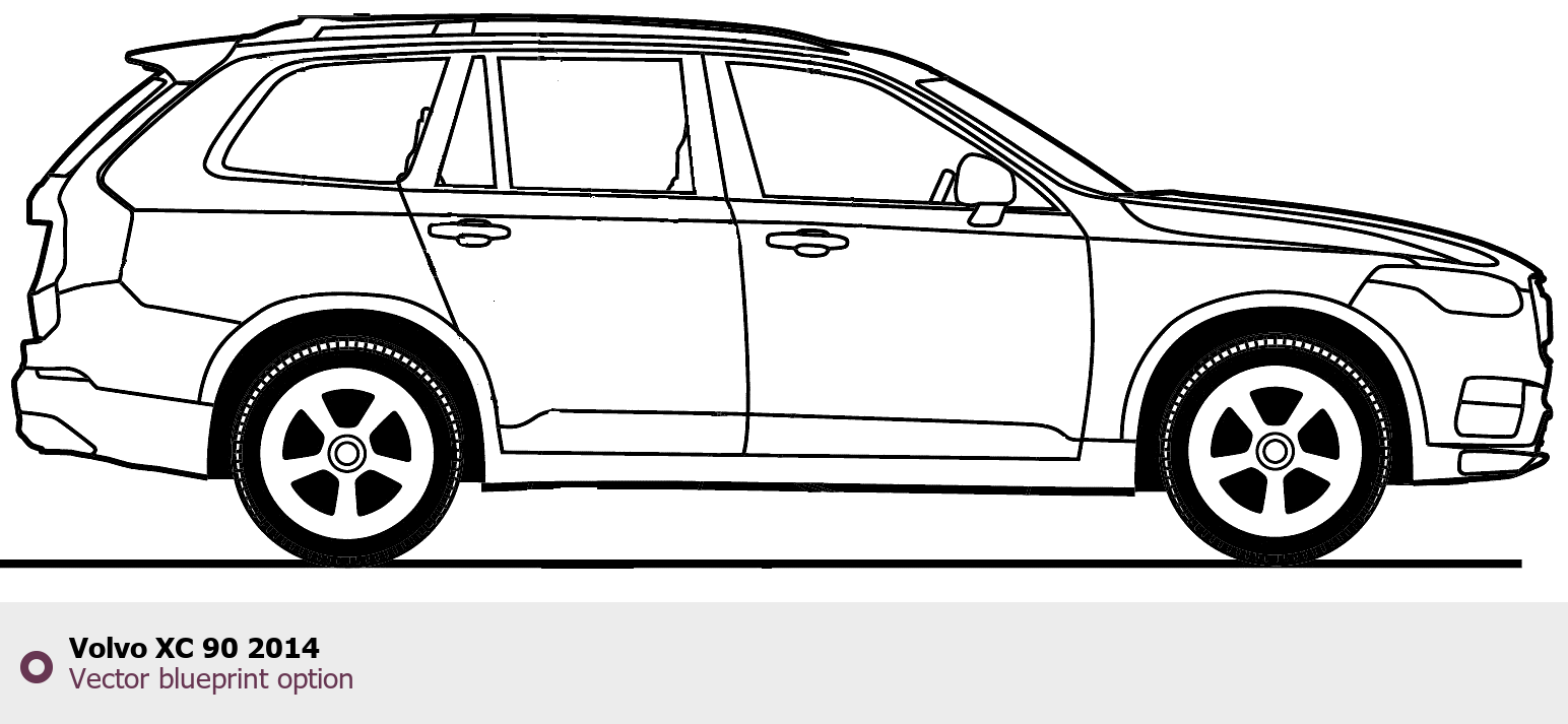 Raster blueprint of the 2014 Volvo XC 90 Tag. This free downloadable image can be used for graphic projects, digital design, and 3D modeling. The file provides accurate exterior proportions of the vehicle. Model year: 2014. Body type: Tag.