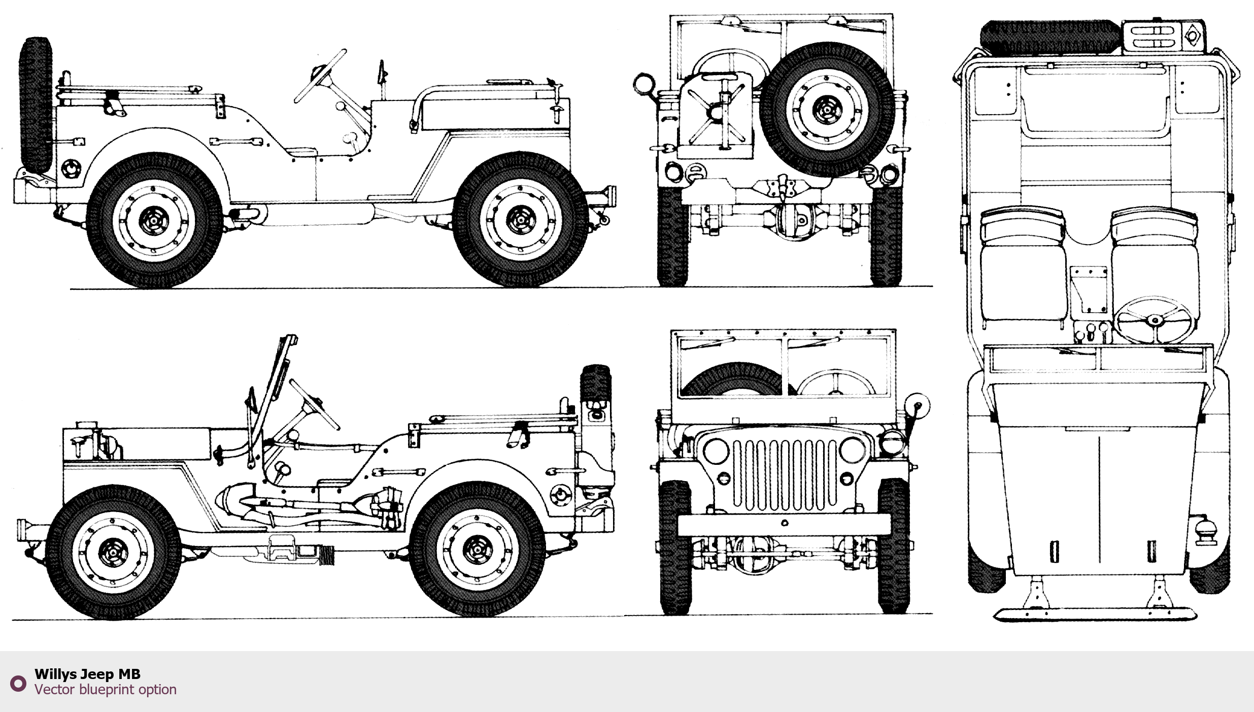 Raster blueprint of the Willys Jeep MB SUV. This free downloadable image can be used for graphic projects, digital design, and 3D modeling. The file provides accurate exterior proportions of the vehicle. Body type: SUV.