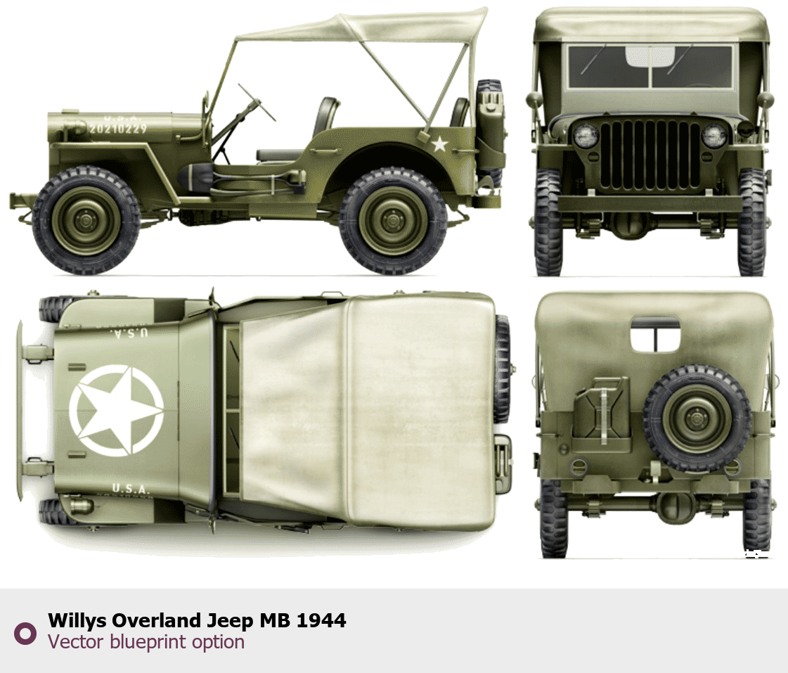 Raster blueprint of the 1944 Willys Overland Jeep MB SUV. This free downloadable image can be used for graphic projects, digital design, and 3D modeling. The file provides accurate exterior proportions of the vehicle. Model year: 1944. Body type: SUV.