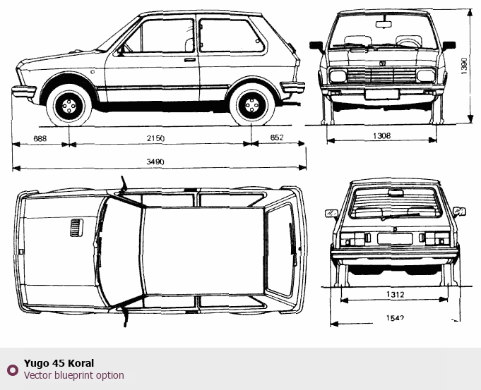 Raster blueprint of the Yugo 45 Koral Tag. This free downloadable image can be used for graphic projects, digital design, and 3D modeling. The file provides accurate exterior proportions of the vehicle. Body type: Tag.