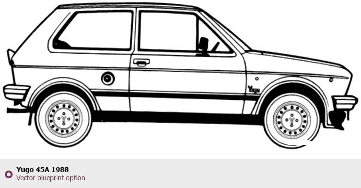 Raster blueprint of the 1988 Yugo 45A Tag. This free downloadable image can be used for graphic projects, digital design, and 3D modeling. The file provides accurate exterior proportions of the vehicle. Model year: 1988. Body type: Tag.