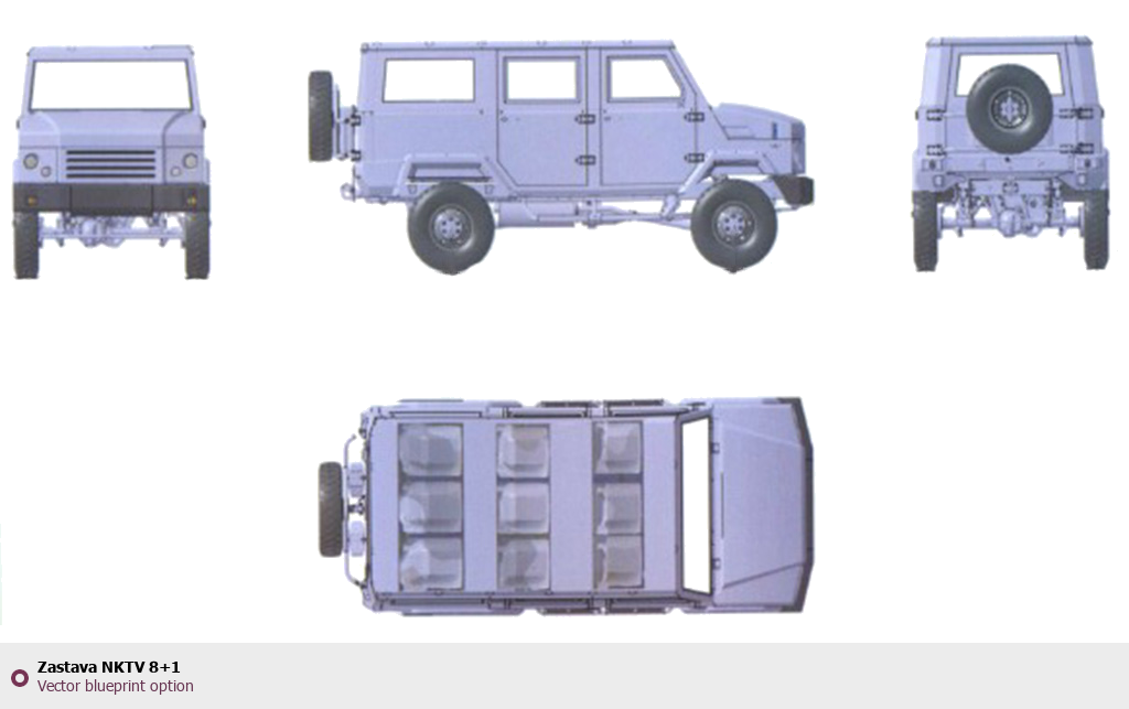 Raster blueprint of the Zastava NKTV 8+1 Tag. This free downloadable image can be used for graphic projects, digital design, and 3D modeling. The file provides accurate exterior proportions of the vehicle. Body type: Tag.