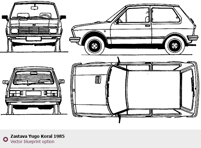 Raster blueprint of the 1985 Zastava Yugo Koral Hatchback. This free downloadable image can be used for graphic projects, digital design, and 3D modeling. The file provides accurate exterior proportions of the vehicle. Model year: 1985. Body type: Hatchback.