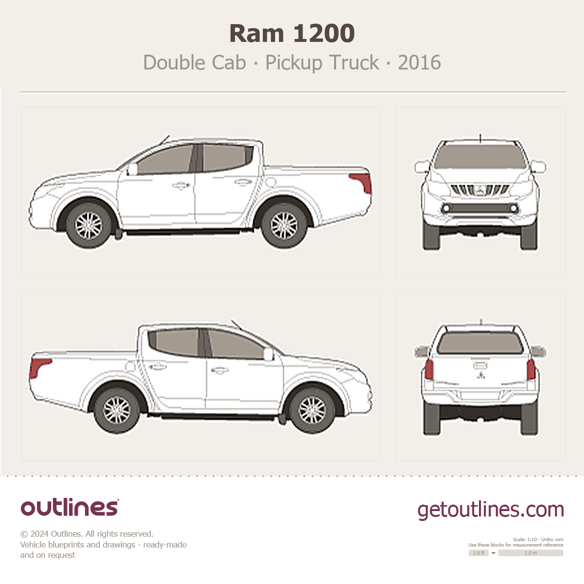 This is a blueprint of the 1200, produced by carmaker Ram in 2016 - Present (2025, 2026). It features a Pickup Truck body design and is classified as a Commercial vehicle.