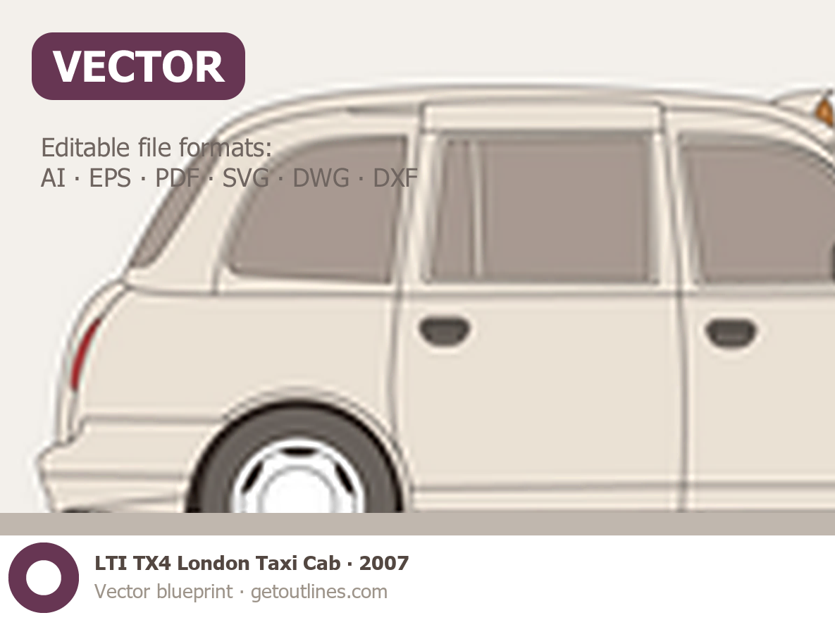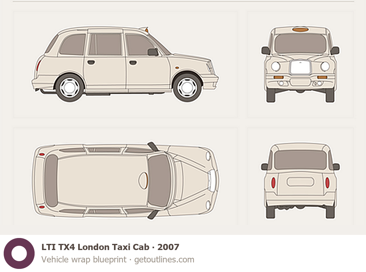 This 2007 LTI TX4 London Taxi Cab Hatchback blueprint helps designers, wrap studios, and 3D artists simplify their workflow and save valuable time for creative work instead of routine tasks.