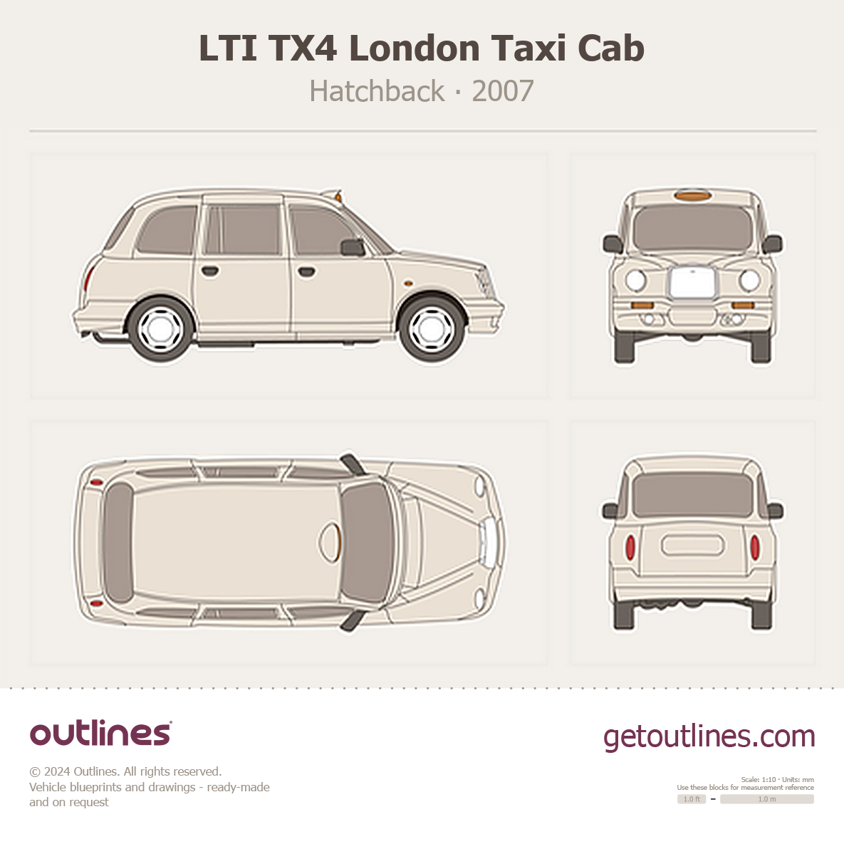 This is a blueprint of the TX4 London Taxi Cab, produced by carmaker LTI in 2007 - Present (2025, 2026). It features a Hatchback body design and is classified as a Commercial vehicle.