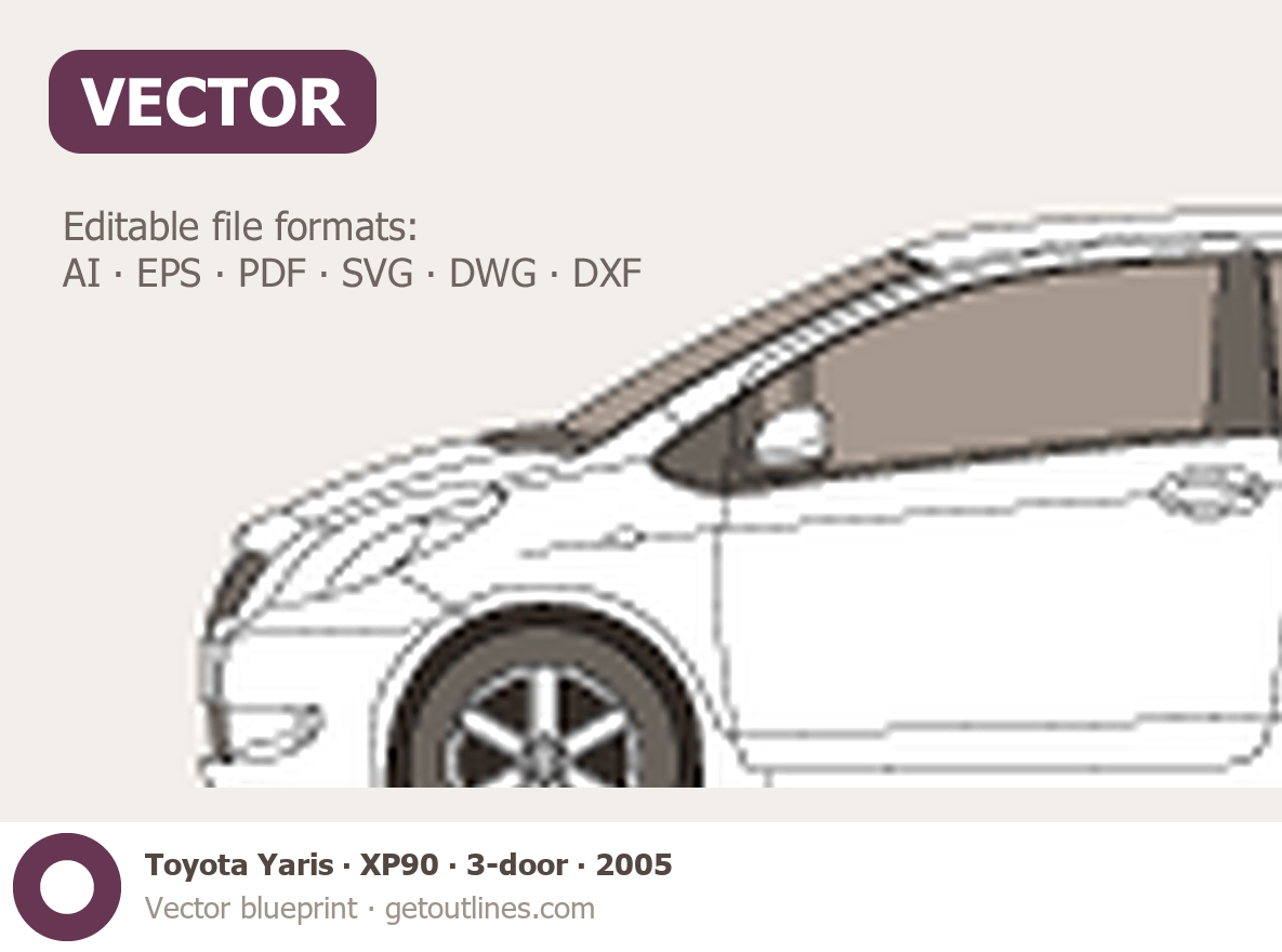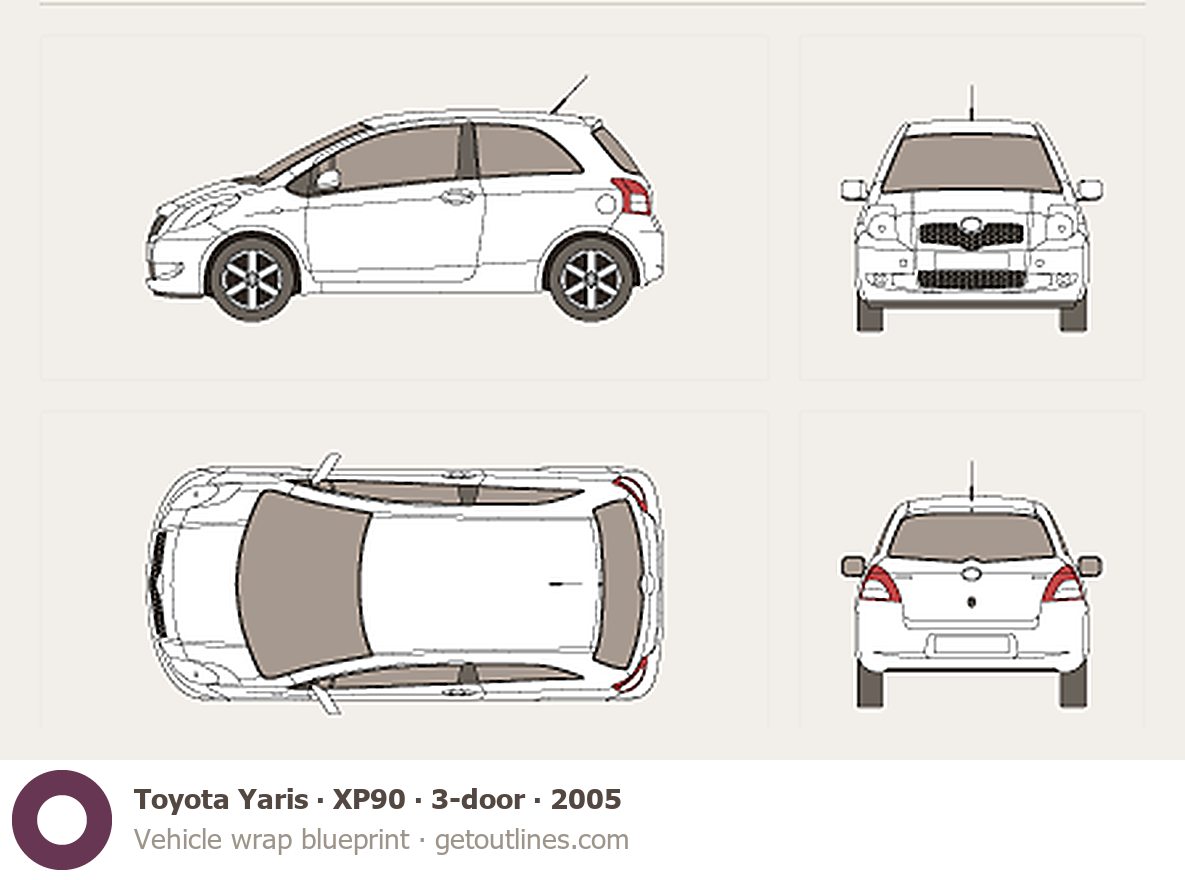This 2005 Toyota Yaris XP90 3-door Hatchback blueprint helps designers, wrap studios, and 3D artists simplify their workflow and save valuable time for creative work instead of routine tasks.