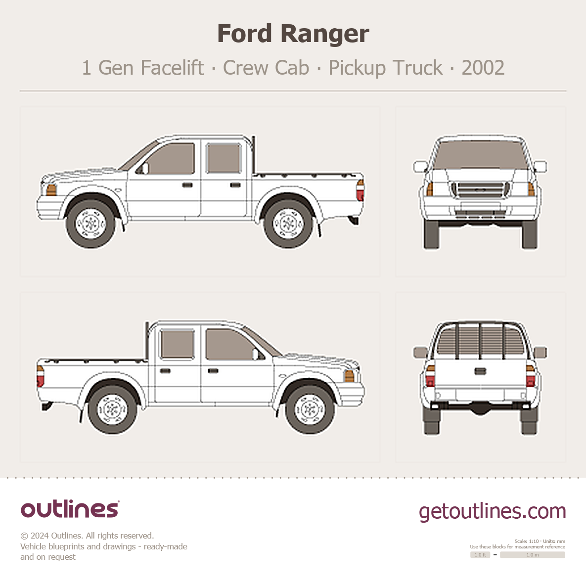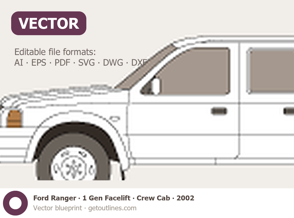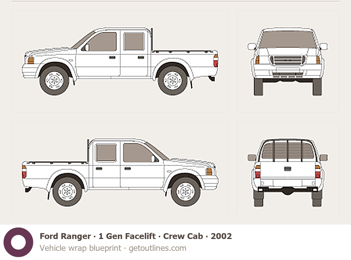 Buy this Ford Ranger 1 Gen Facelift blueprint and line drawing in high-quality editable vector file formats. Best for 3D and car wrap design.