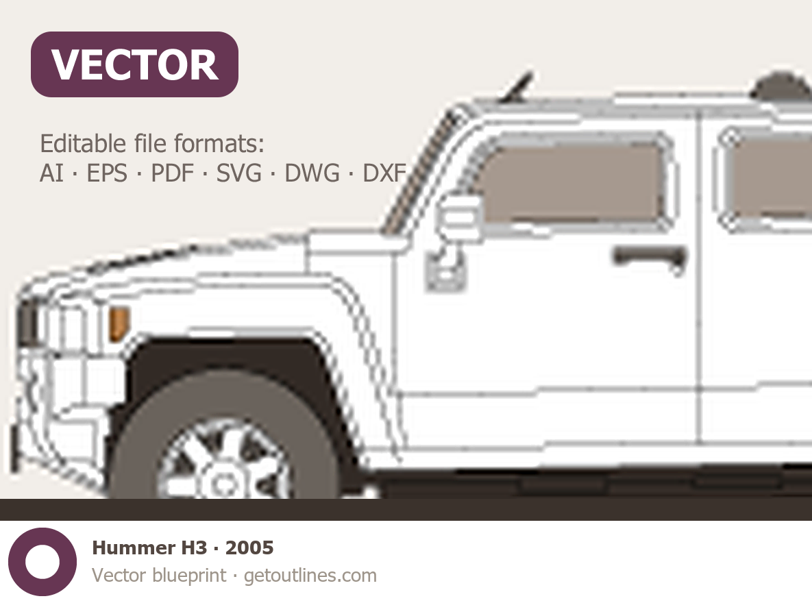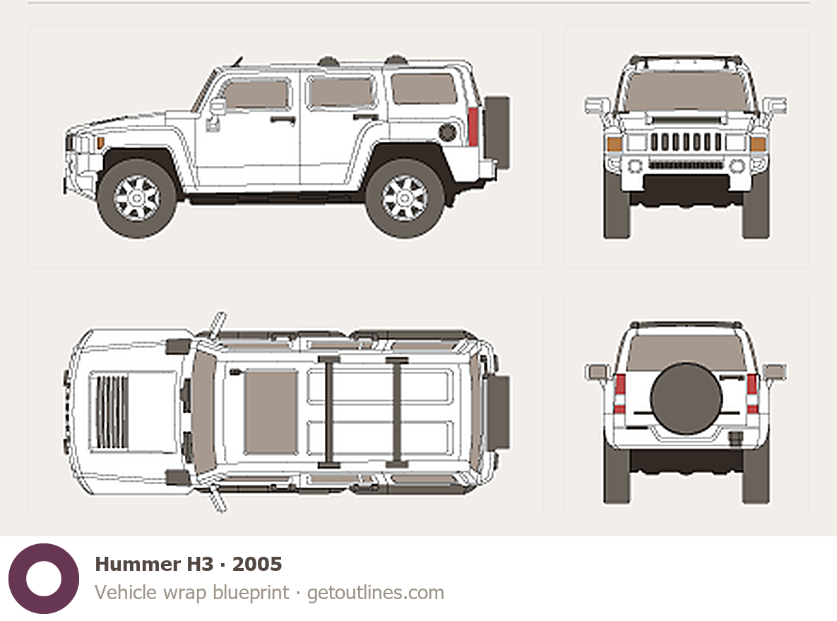 This 2005 Hummer H3 SUV blueprint helps designers, wrap studios, and 3D artists simplify their workflow and save valuable time for creative work instead of routine tasks.