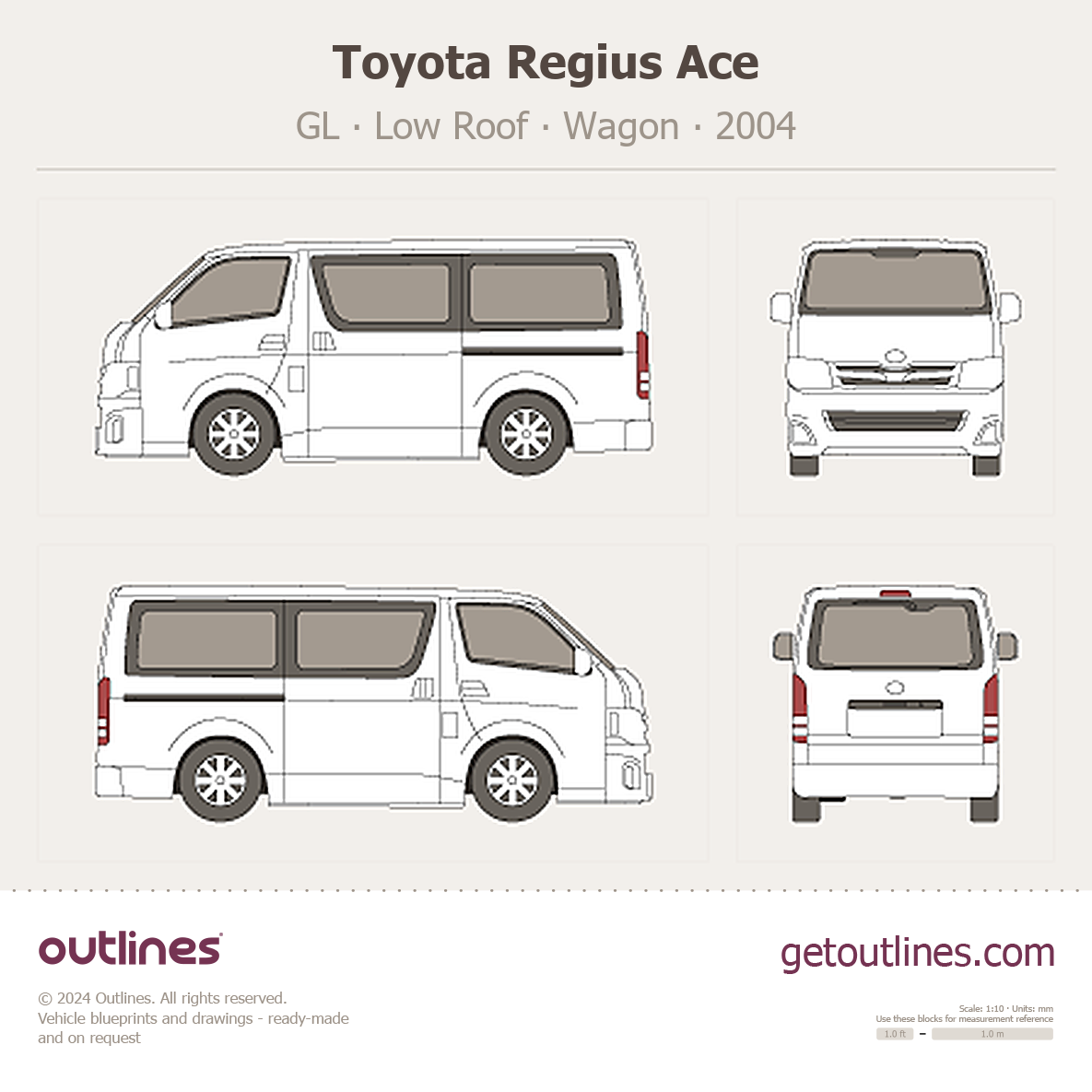 This is a blueprint of the Regius Ace, produced by carmaker Toyota in 2004 - Present (2025, 2026). It features a Wagon body design and is classified as a Commercial vehicle.