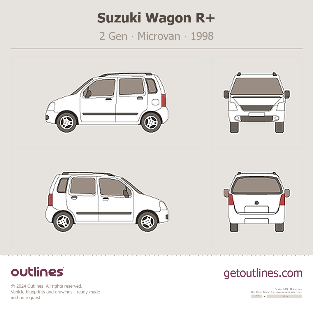 This is a blueprint of the Wagon R+, produced by carmaker Suzuki in 1998 - 2003. It features a Microvan body design and is classified as a Commercial vehicle.