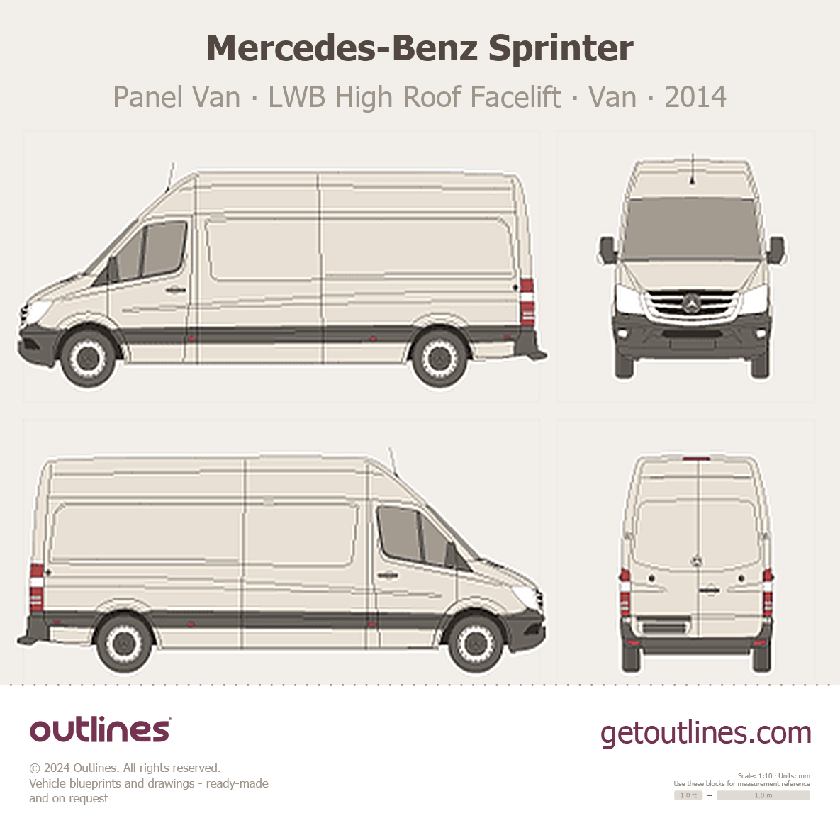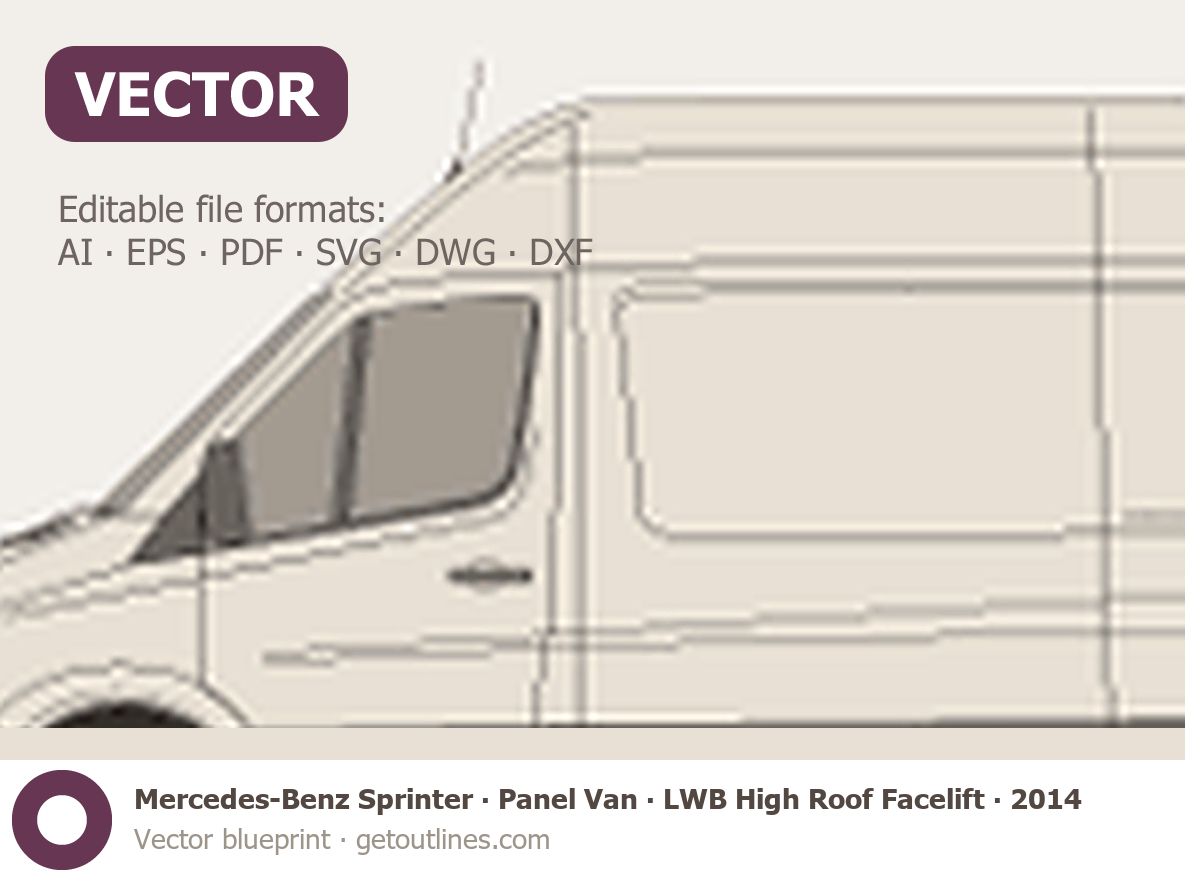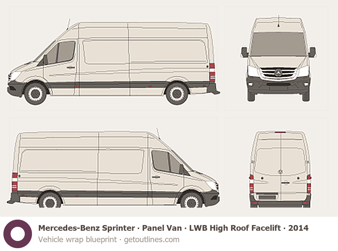 This 2014 Mercedes-Benz Sprinter Panel Van LWB High Roof Facelift Van blueprint helps designers, wrap studios, and 3D artists simplify their workflow and save valuable time for creative work instead of routine tasks.