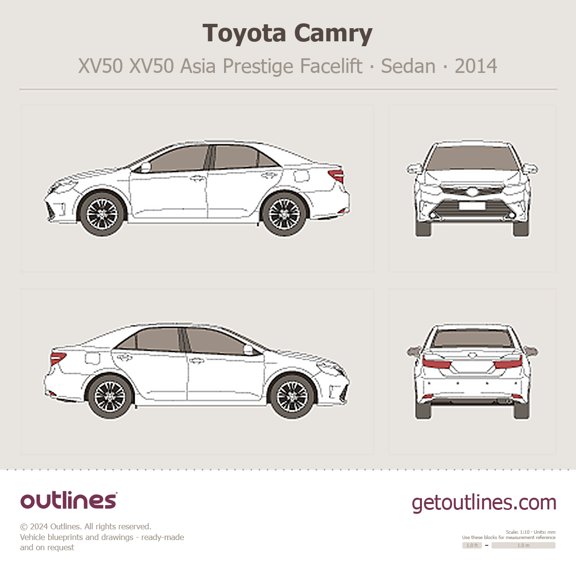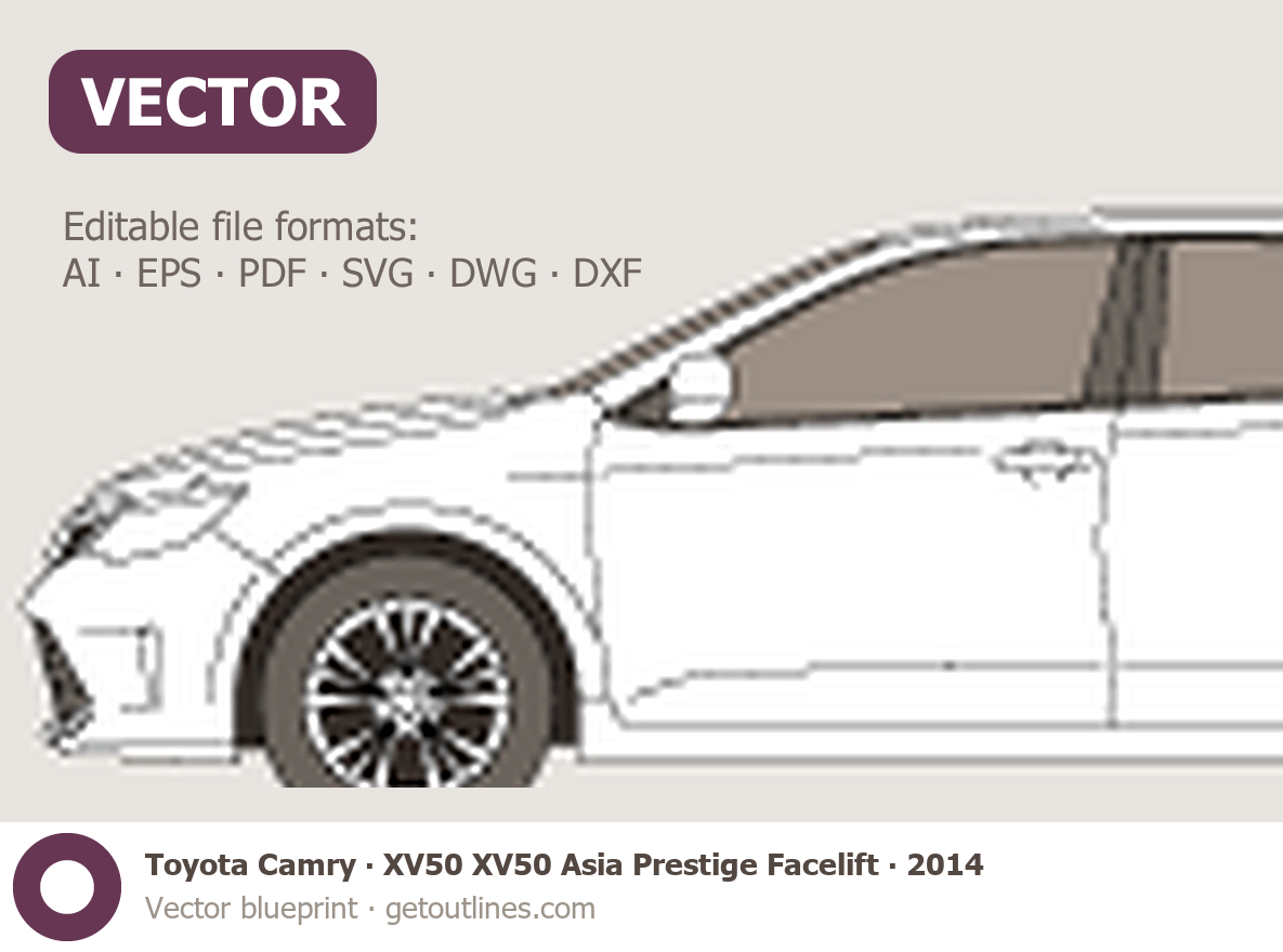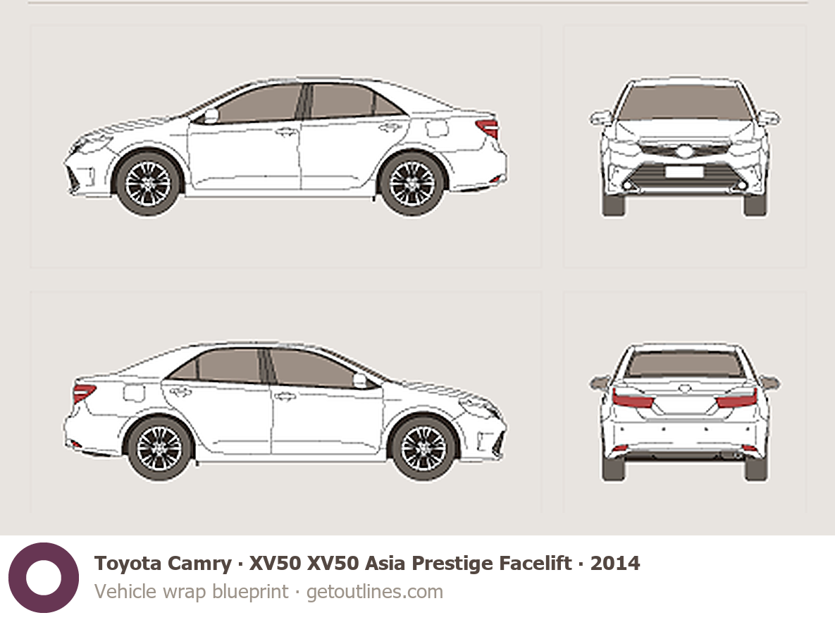 This 2014 Toyota Camry XV50 XV50 Asia Prestige Facelift Sedan blueprint helps designers, wrap studios, and 3D artists simplify their workflow and save valuable time for creative work instead of routine tasks.