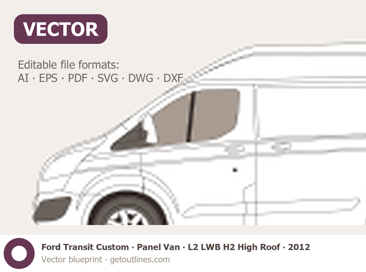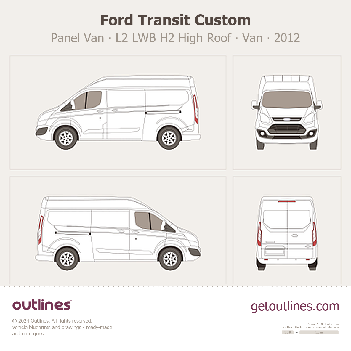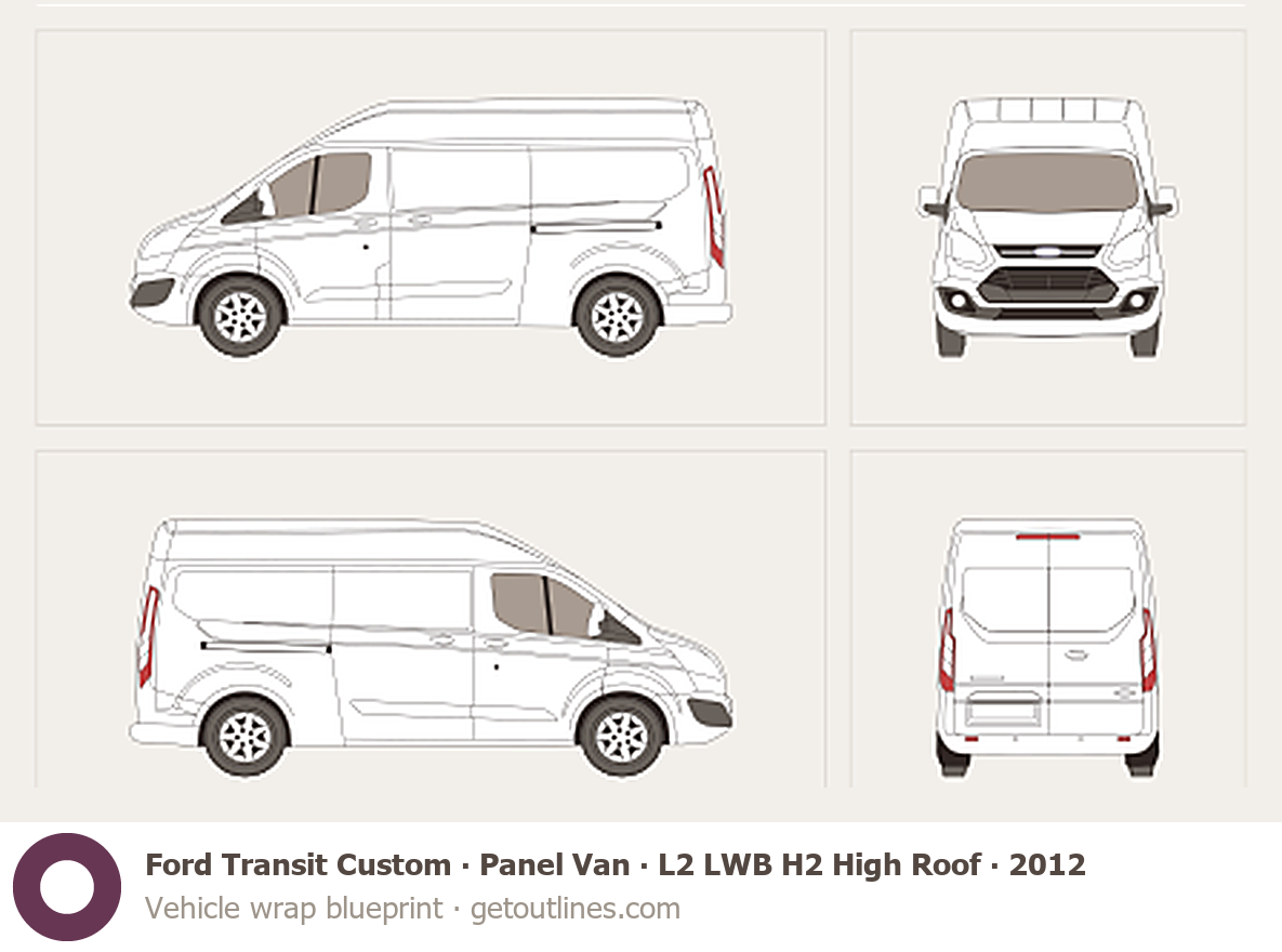 This 2012 Ford Transit Custom Panel Van L2 LWB H2 High Roof Van blueprint helps designers, wrap studios, and 3D artists simplify their workflow and save valuable time for creative work instead of routine tasks.