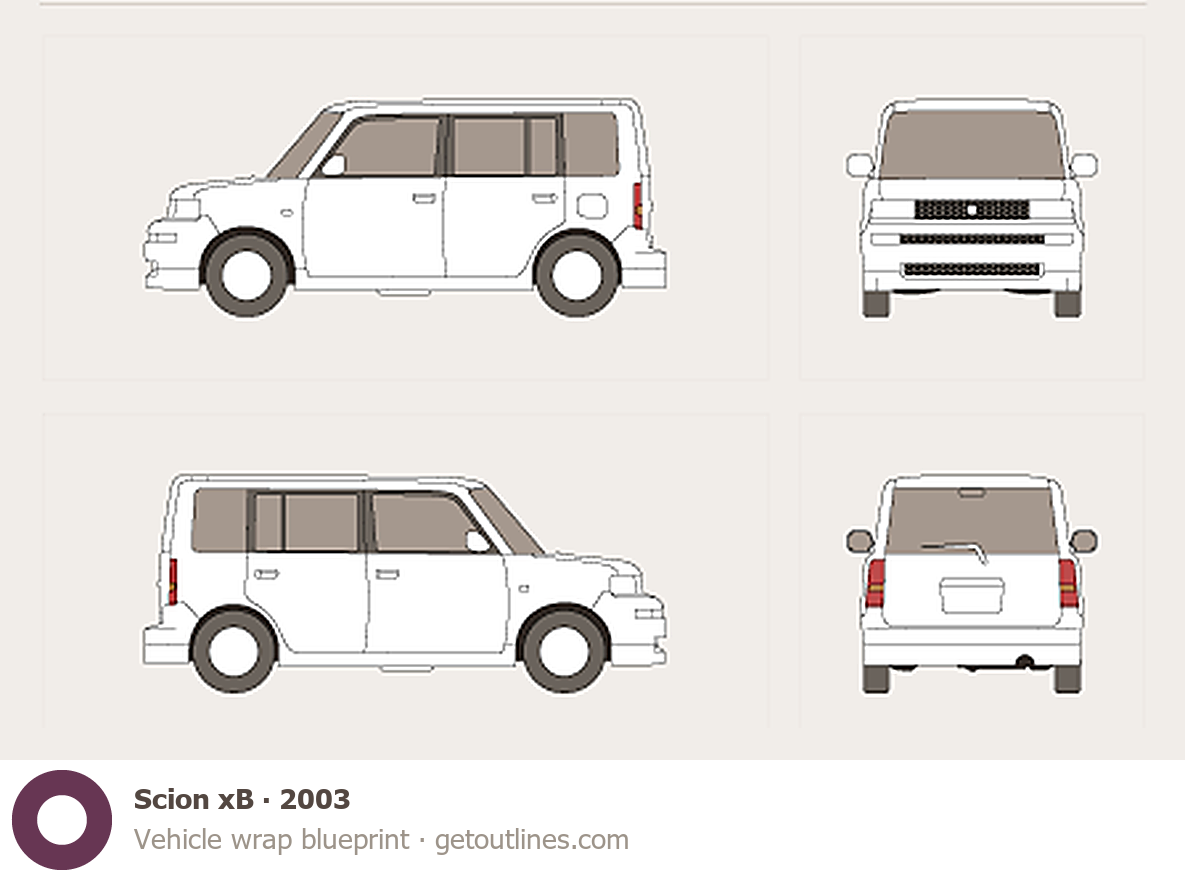 This template is suitable for Scion xB models from 2003 to 2007, including 2003, 2004, 2005, 2006, and 2007 model years, and is commonly used for vehicle wrap and signage design.
