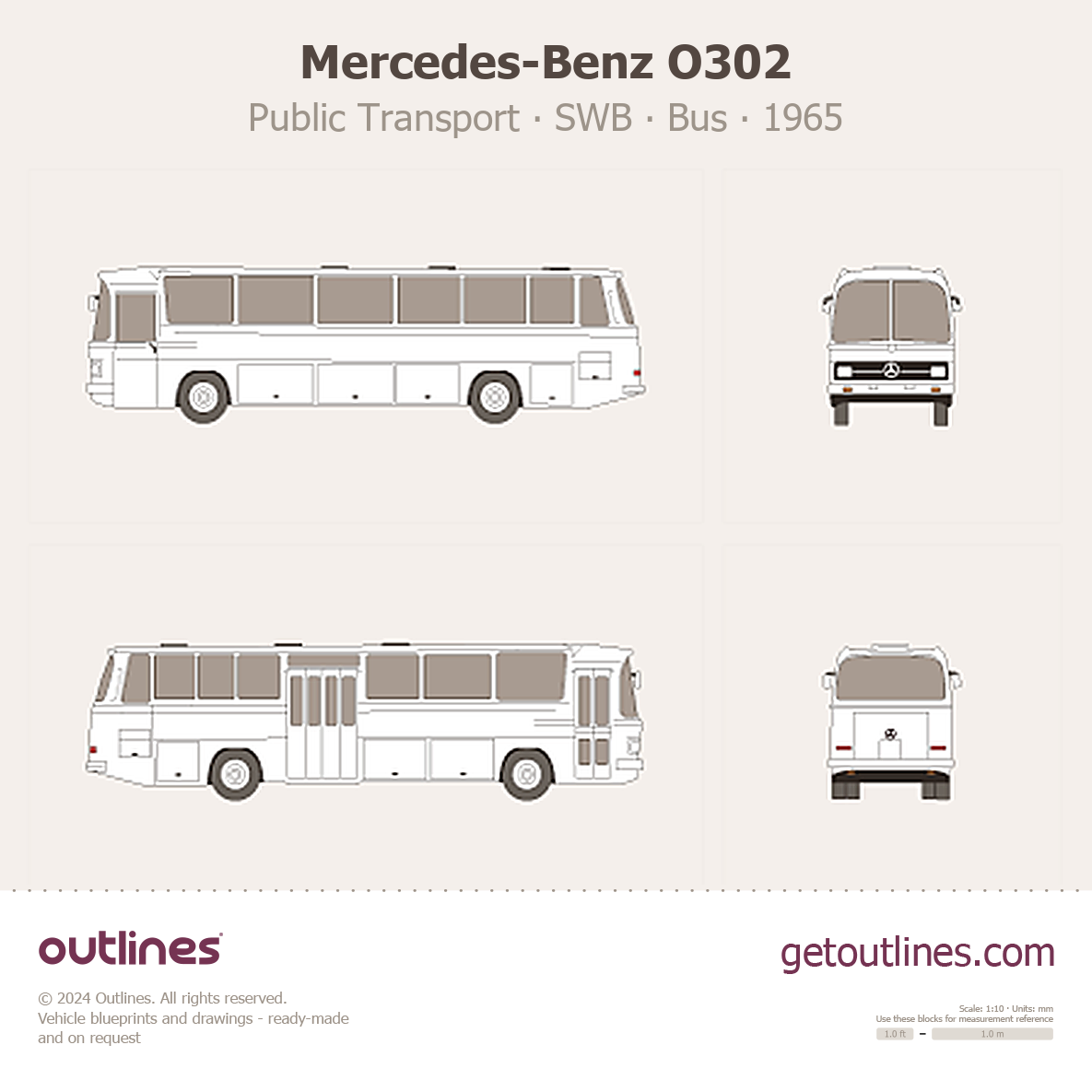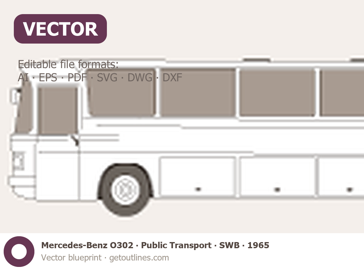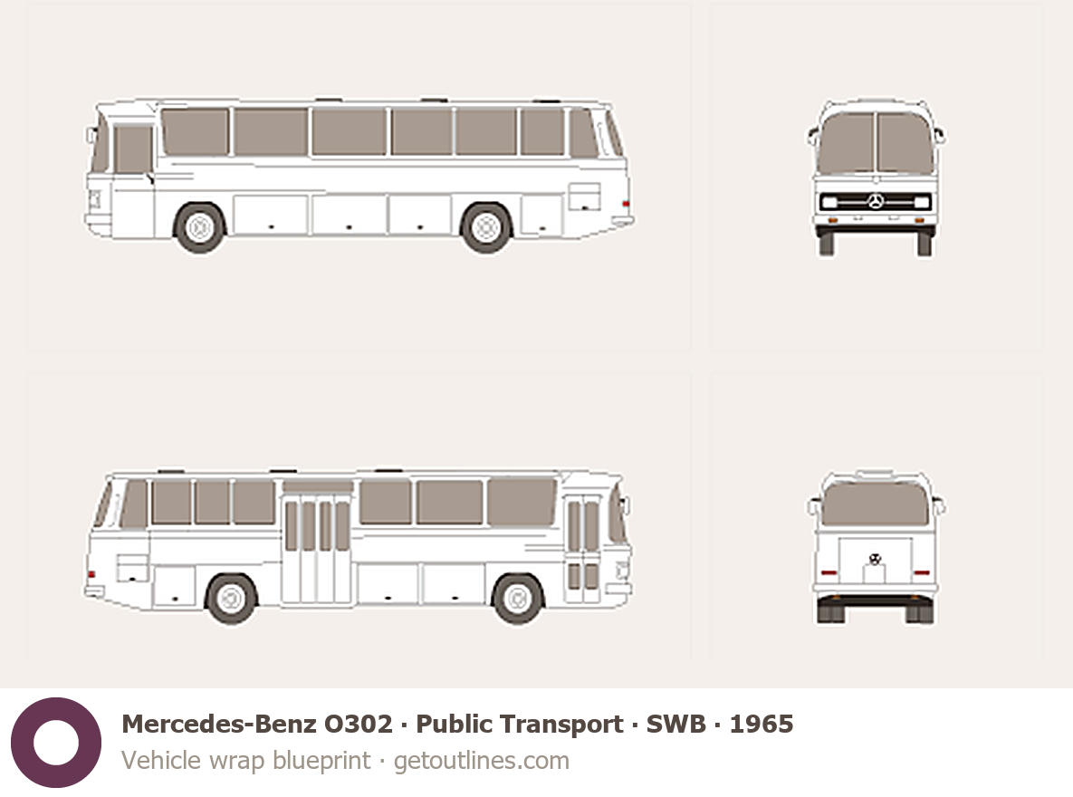 This 1965 Mercedes-Benz O302 Public Transport SWB Bus blueprint helps designers, wrap studios, and 3D artists simplify their workflow and save valuable time for creative work instead of routine tasks.
