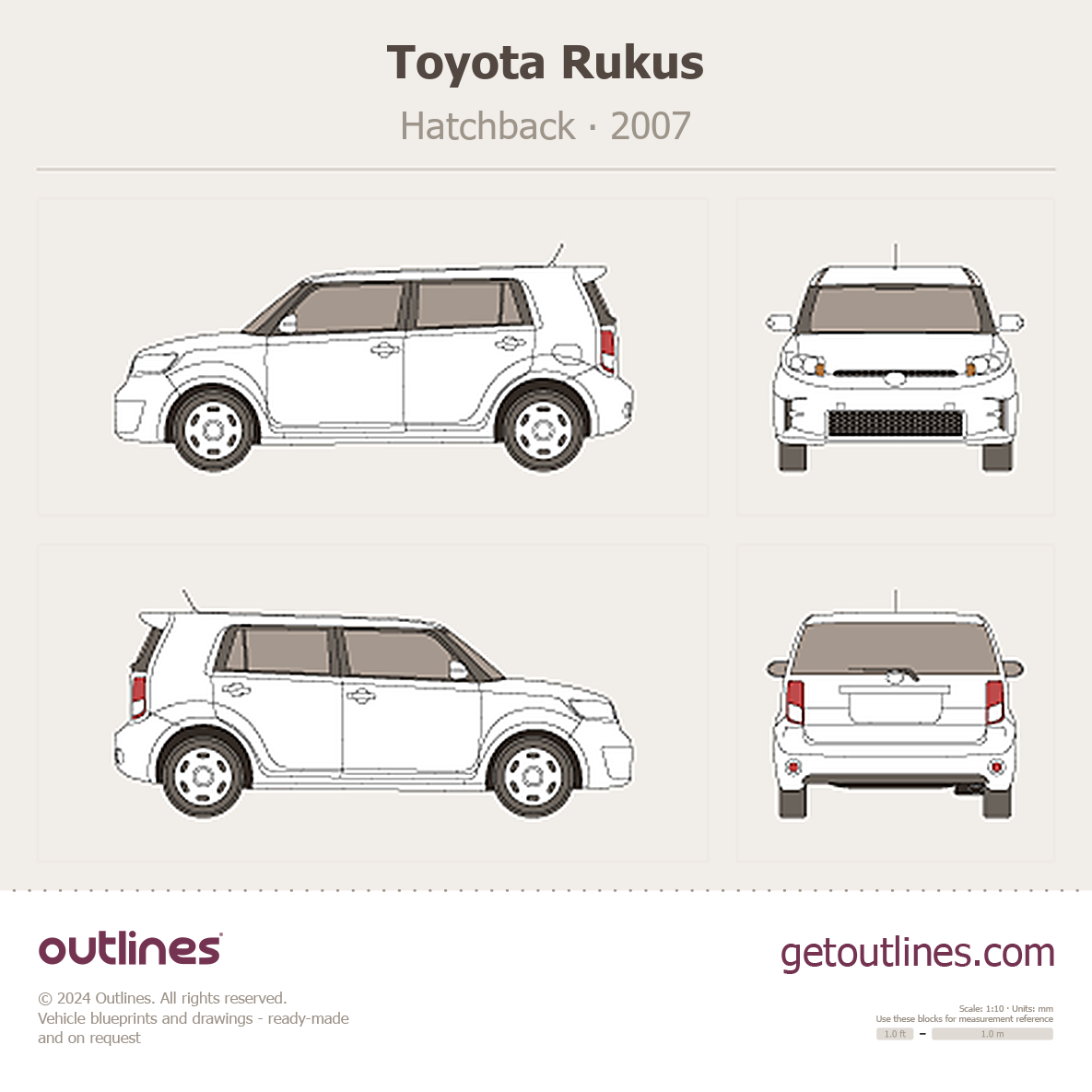 This is a blueprint of the Rukus, produced by carmaker Toyota in 2007 - 2015. It features a Hatchback body design and is classified as a Compact vehicle.