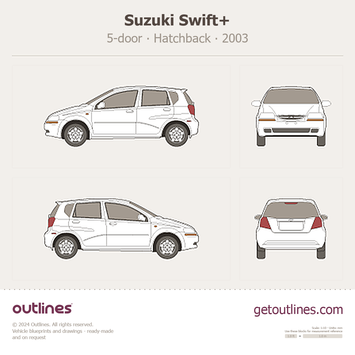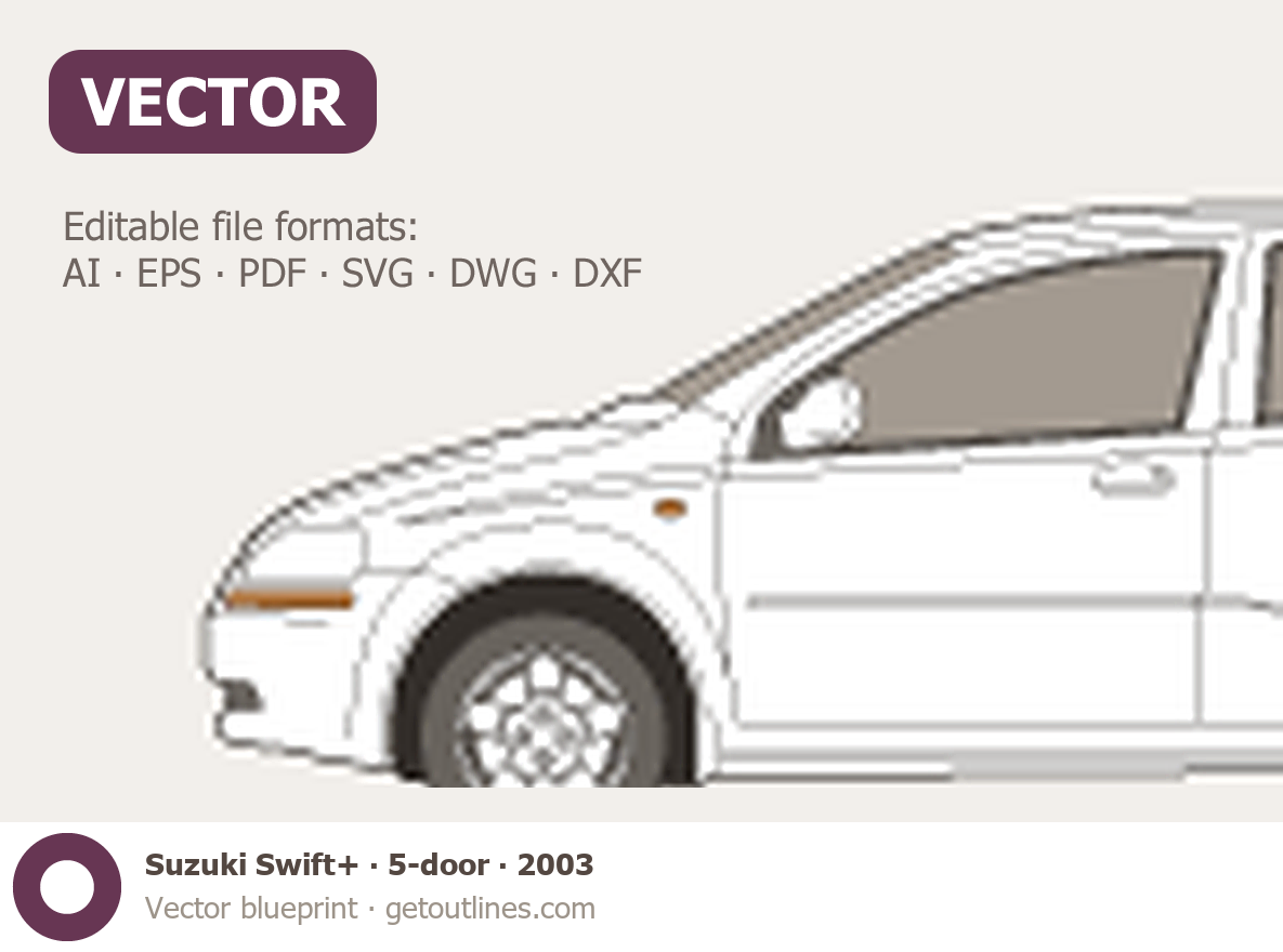 Buy this Suzuki Swift+ blueprint and line drawing in high-quality editable vector file formats. Best for 3D and car wrap design.