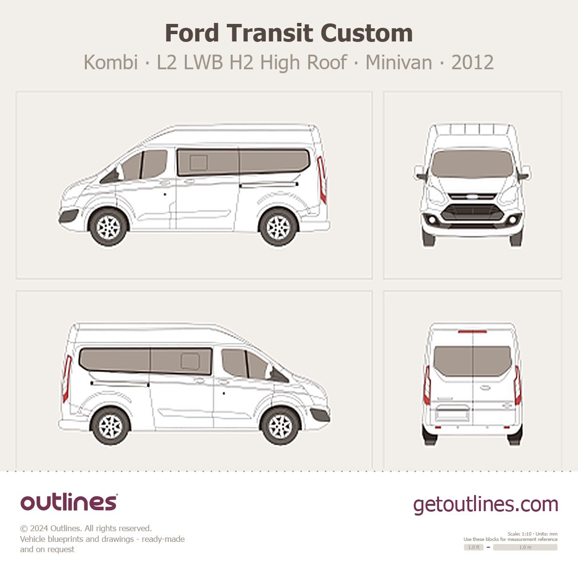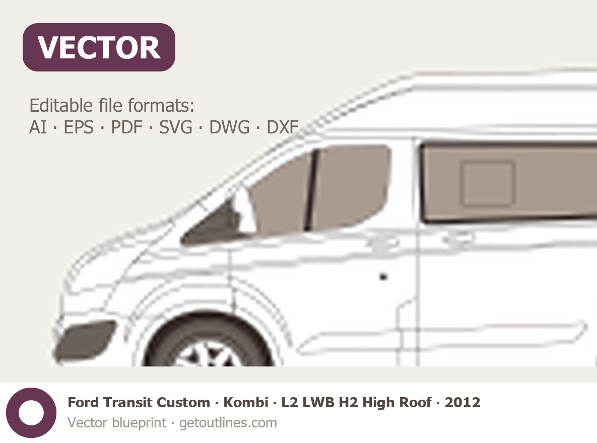 This 2012 Ford Transit Custom Kombi L2 LWB H2 High Roof Minivan blueprint helps designers, wrap studios, and 3D artists simplify their workflow and save valuable time for creative work instead of routine tasks.