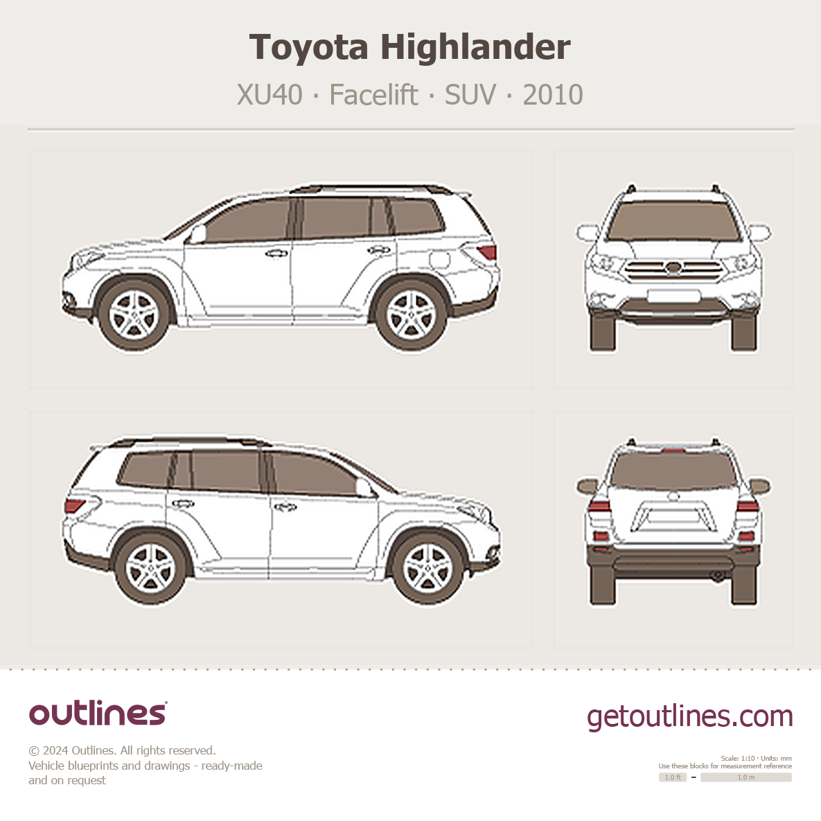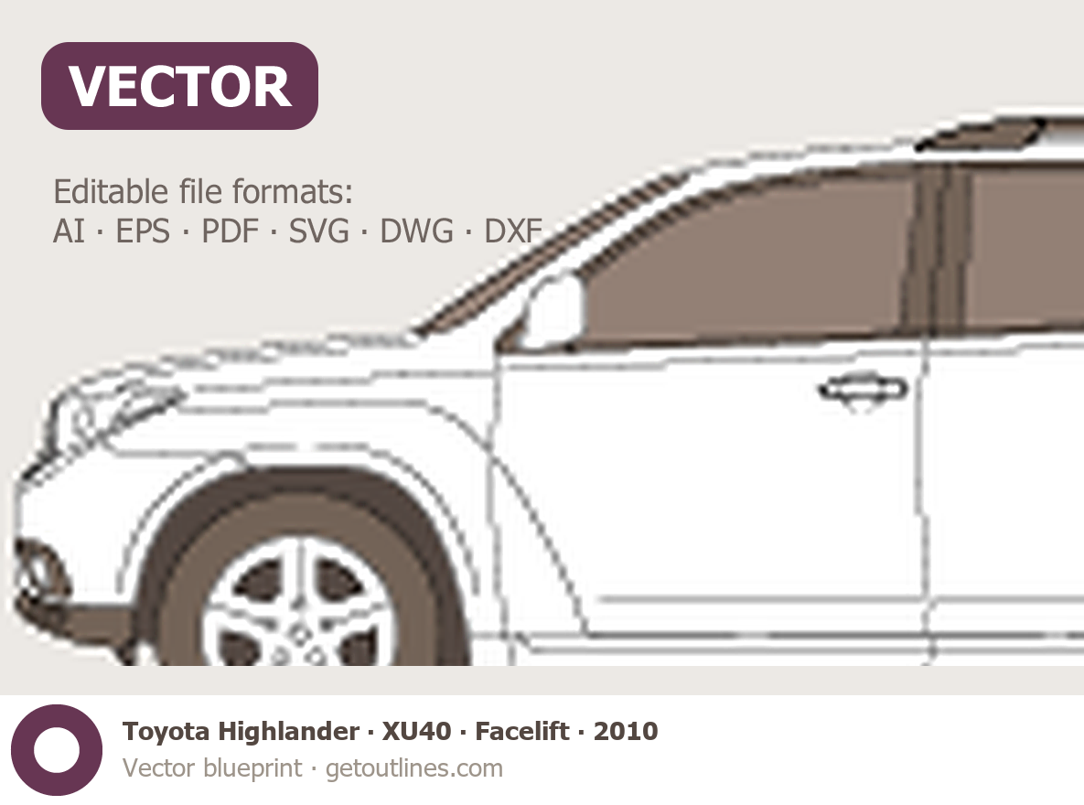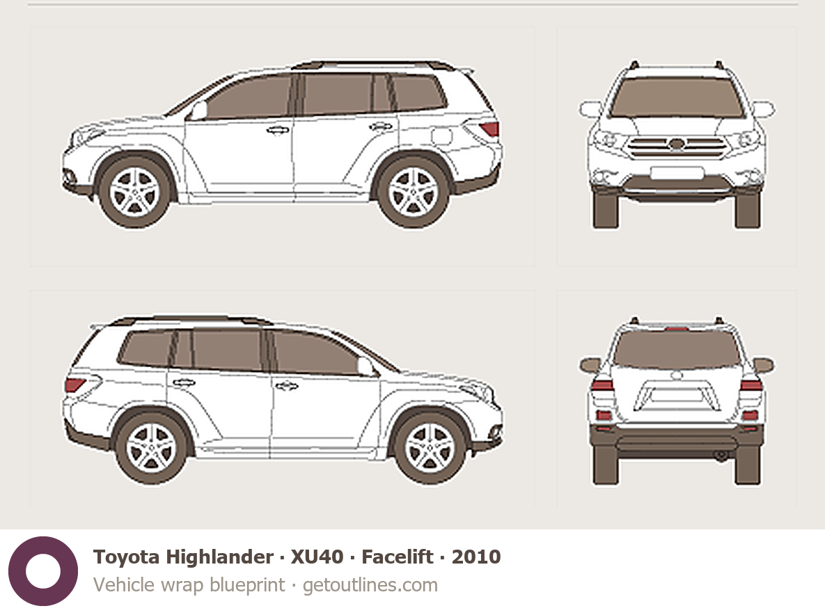 Buy this Toyota Highlander XU40 blueprint and line drawing in high-quality editable vector file formats. Best for 3D and car wrap design.