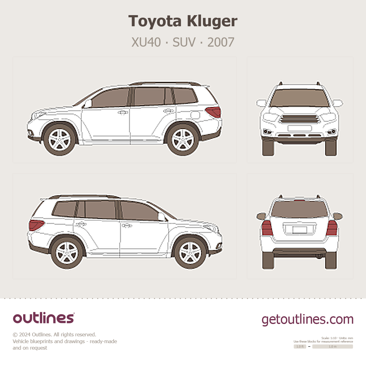 Buy this Toyota Kluger XU40 blueprint and line drawing in high-quality editable vector file formats. Best for 3D and car wrap design.