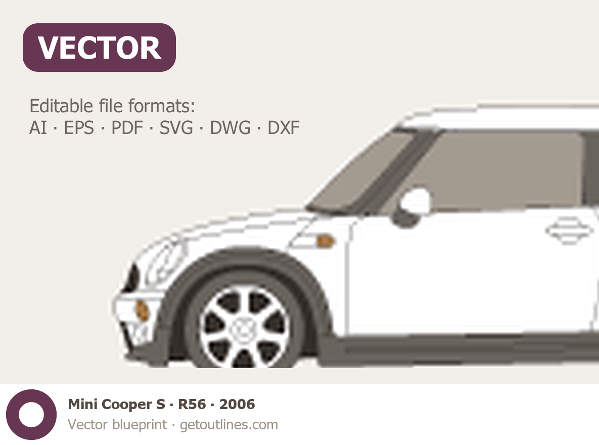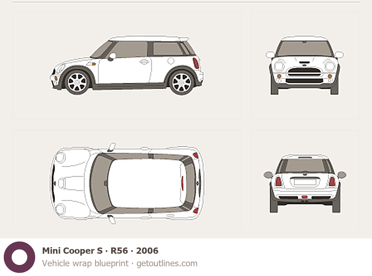 Buy this Mini Cooper S R56 blueprint and line drawing in high-quality editable vector file formats. Best for 3D and car wrap design.